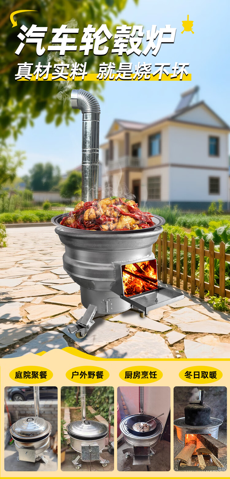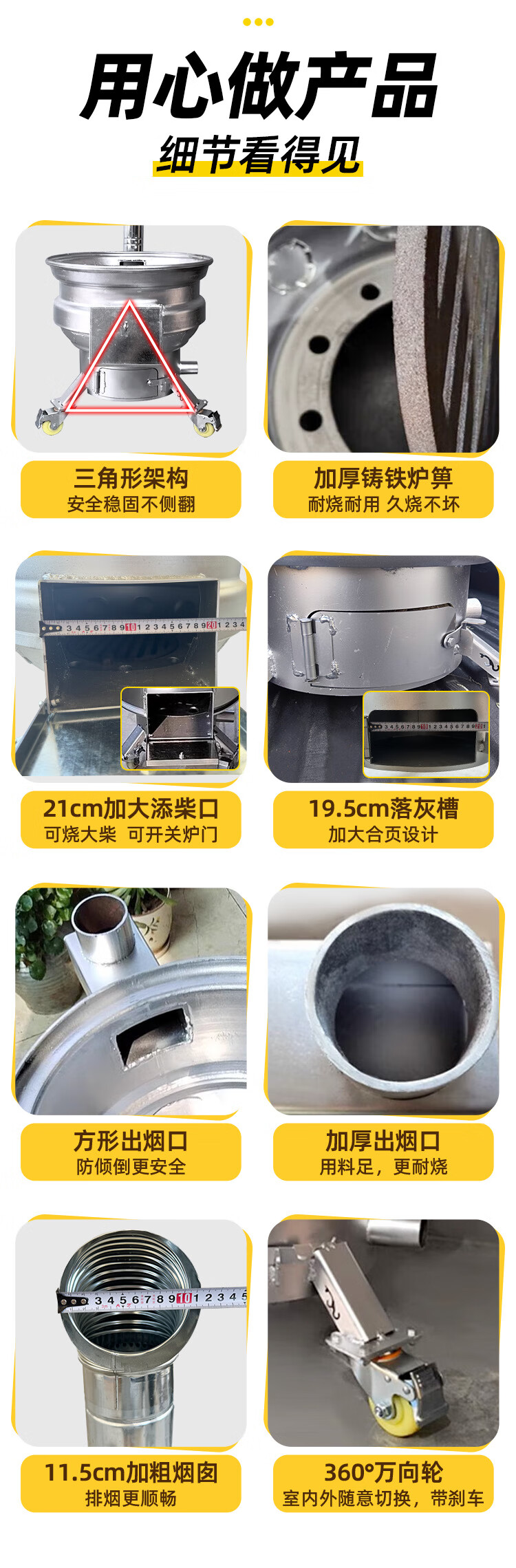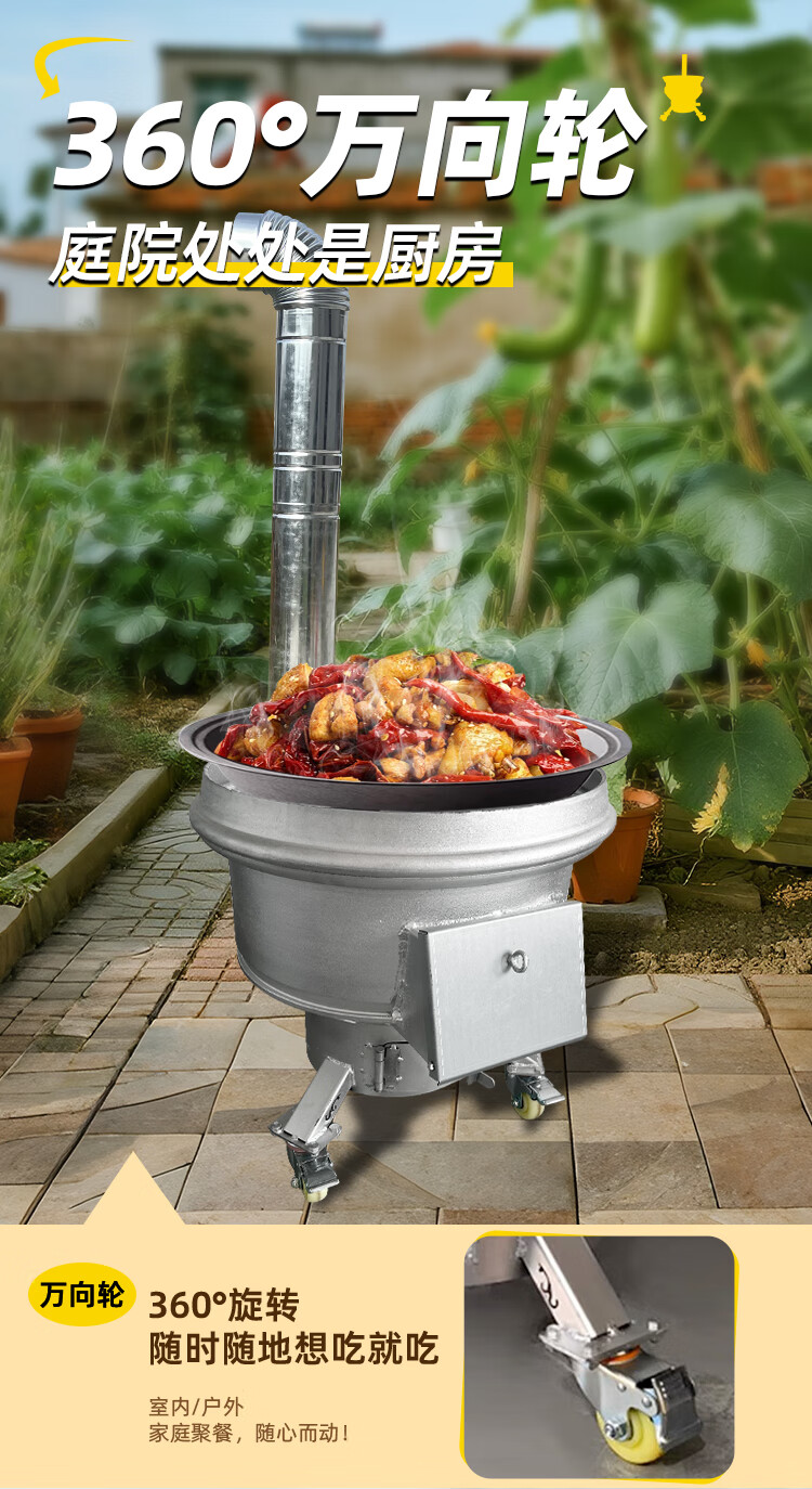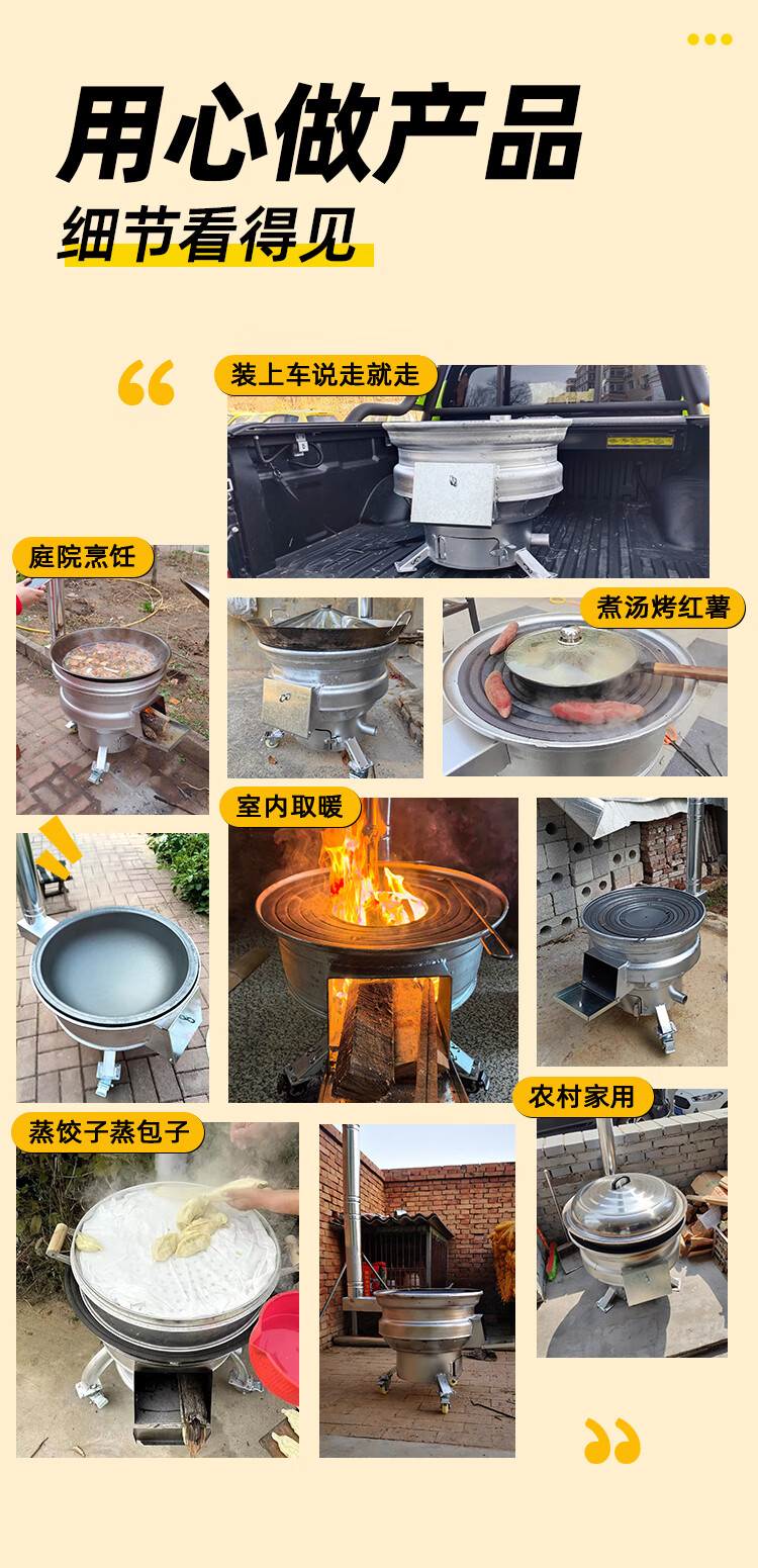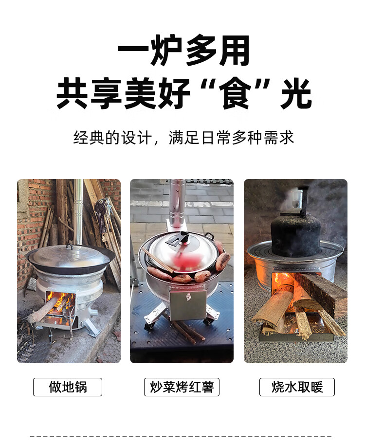 货收到了试用了一下,比较好用,烧柴火大。整体厚实,滑轮设计解决笨重问题,做到方便便捷的效果,有这个炉子再也不怕来亲戚了,直接推到院子里炖大鹅,商家诚信赢天下。值得购买,虽然贵点,但是也是一步到位,可以使用很多年的。