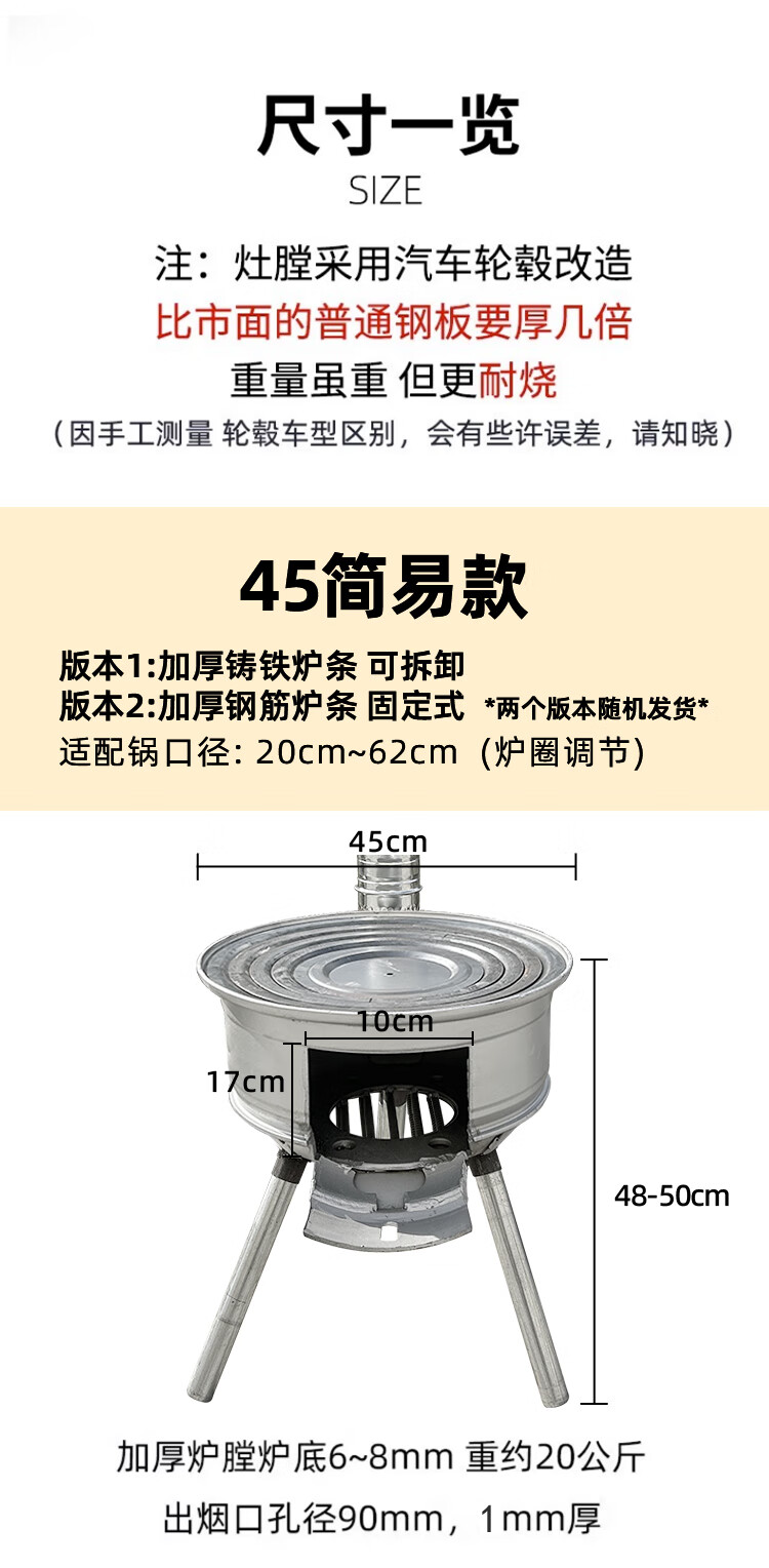 柴火灶与商家描述相符,大小两个轮毂厚重,做工还是不错的,焊接的比价较牢固,总体表现良好,还是值得购买和相信的厂商家。