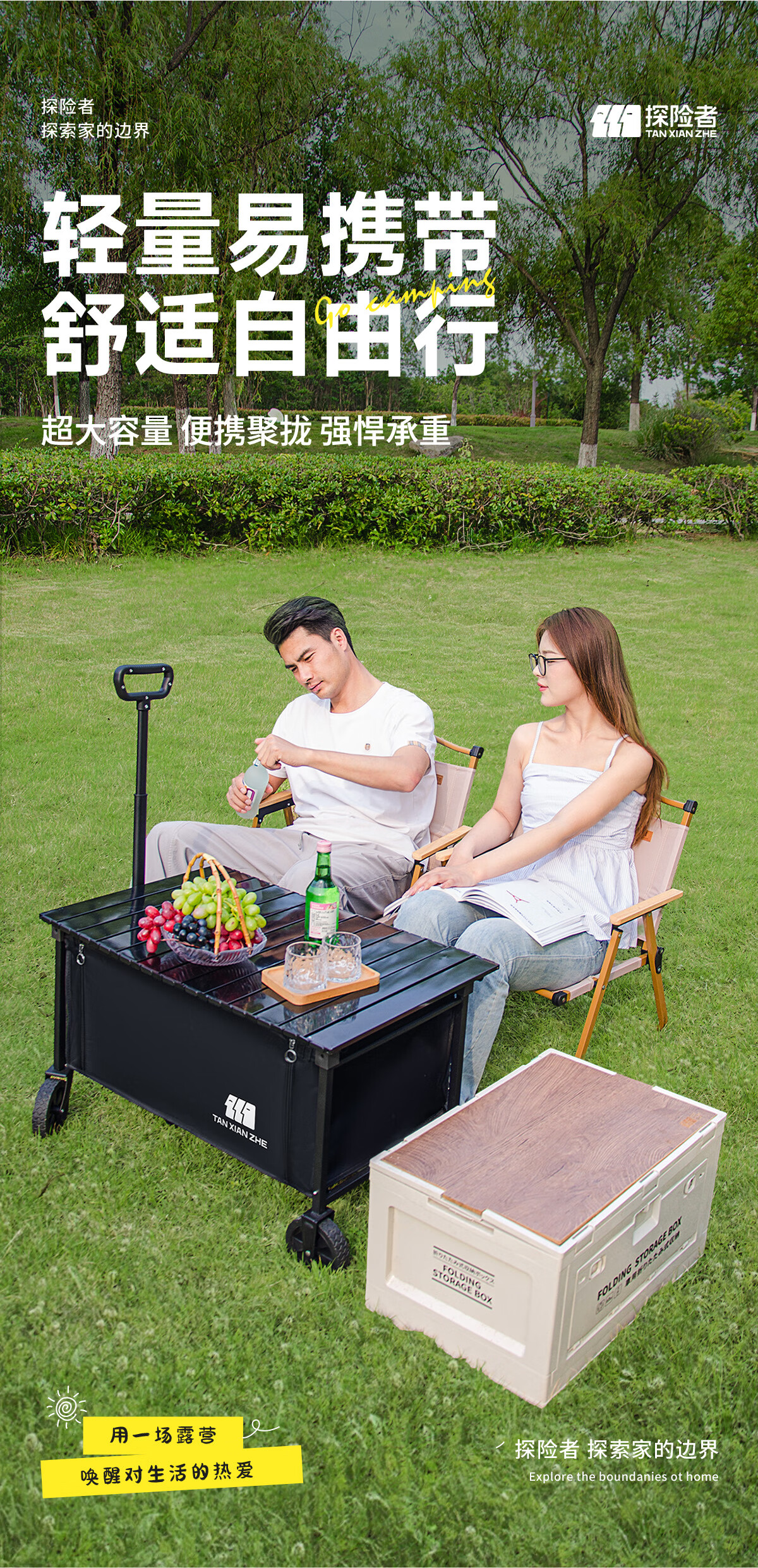 探险者户外露营装备全套七件套带桌板露营车桌椅套装可折叠收纳小推车 极光黑【静音万向轮+加厚车架】
