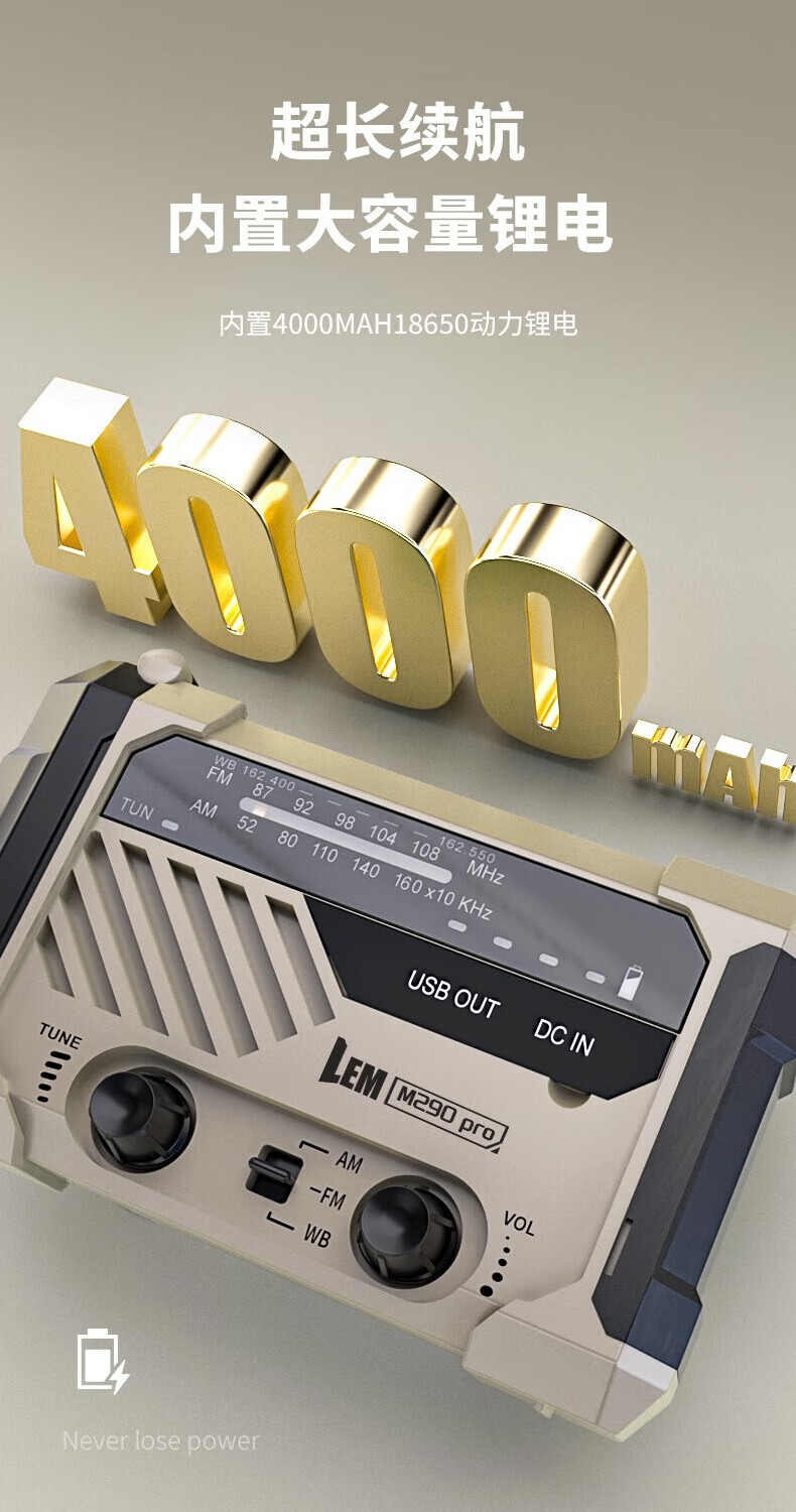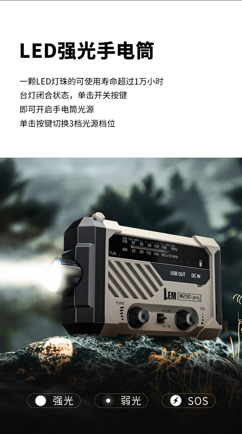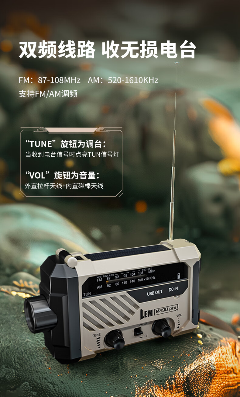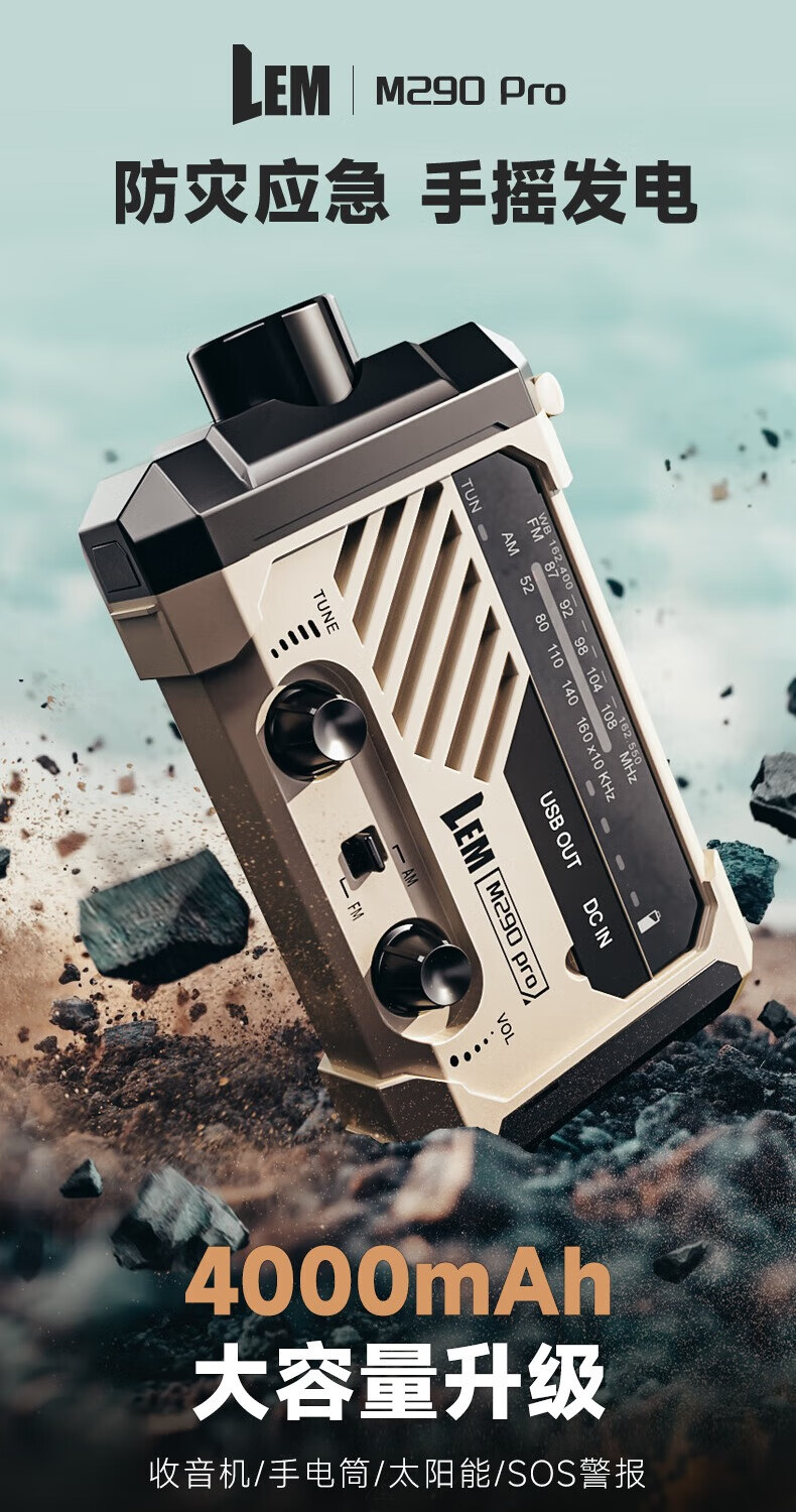 LEM手摇手电筒收音机太阳能发电机应急灾备末日生存装备太阳能充电 M290pro升级版沙漠色/4000毫安