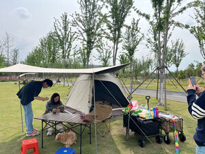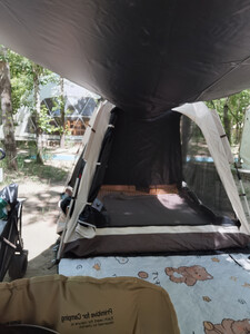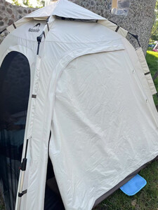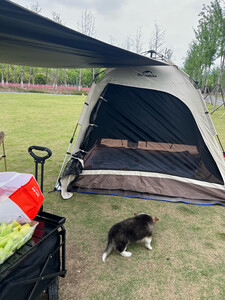 防水效果:还没试过,感觉四面通风如果下起雨来估计会不是那么防水 适用场景:适用于公园防晒露营、过夜无雨露营、休闲露营⛺️ 容纳人数:帐篷内可以四到五人、帐篷外可以五六个人,适合一大家子出行 透气效果:四面都可以通风,比较透气 展开类型:很好,如图 便携性能:方便,帐篷、天幕都有了!