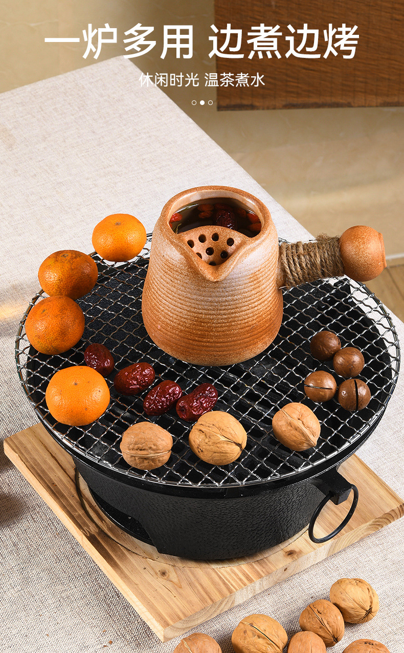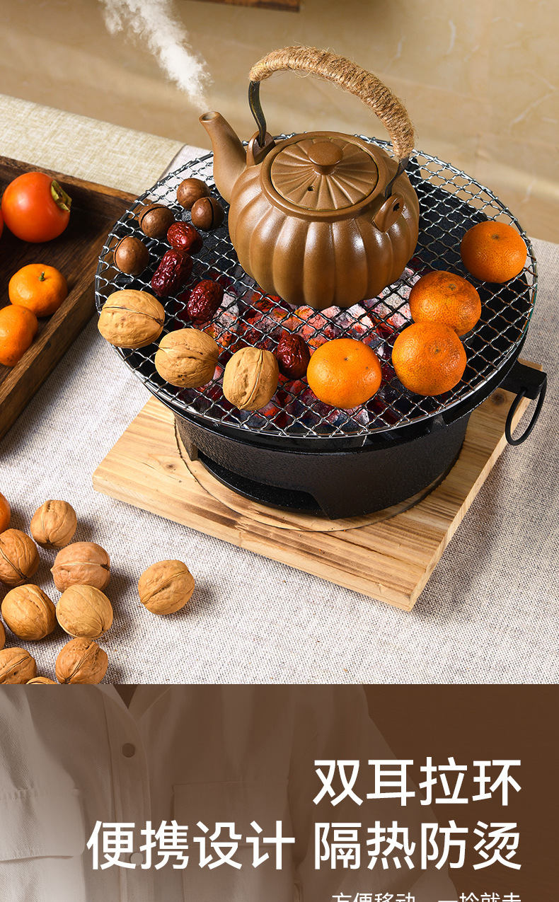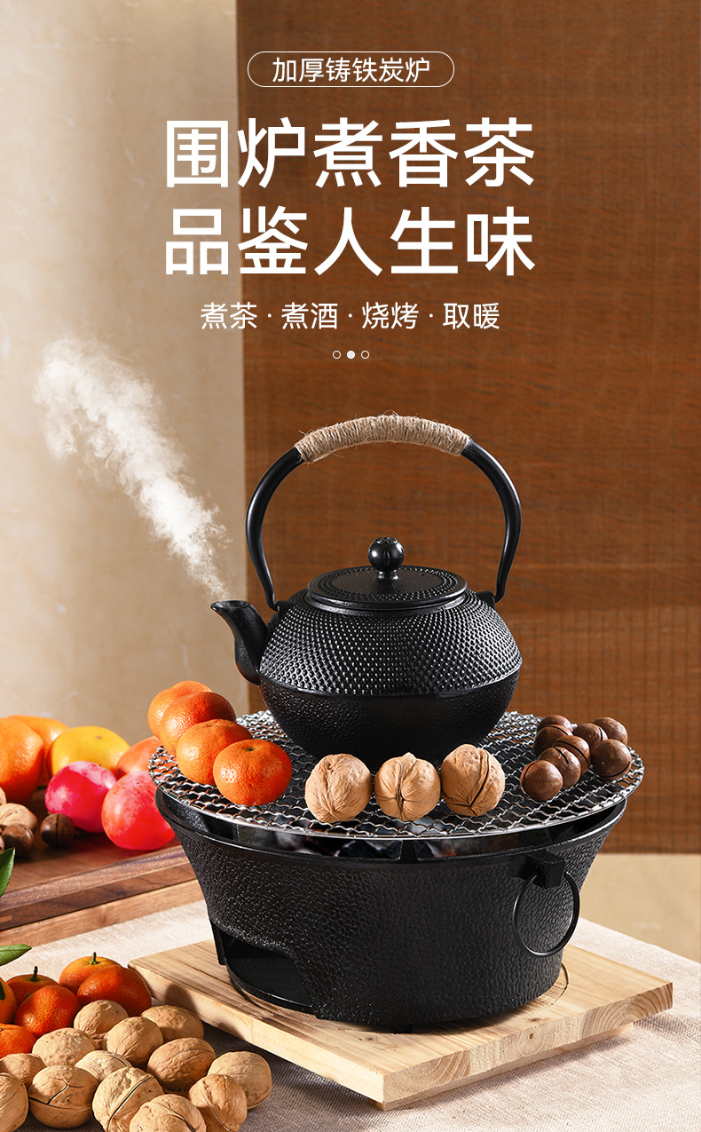 映棠围炉煮茶家用户外铸铁烤炉烧烤室内取暖炉烧烤火盆炉煮茶炉碳炉 加大号28cm(含烤网+隔热底座)