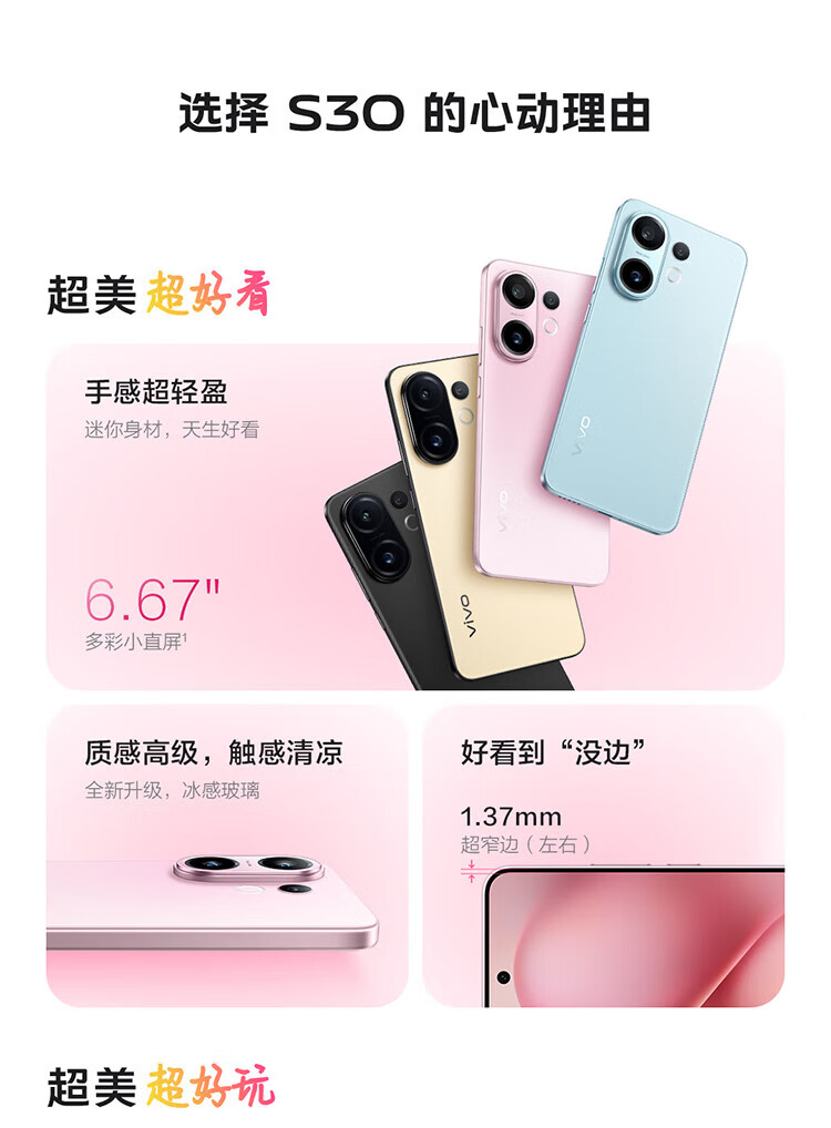 vivo S30 多彩轻薄直屏 超级潜望长焦 学生 live图 AI拍照手机 桃桃粉 12GB+256GB 0元首付+白条12期免息+90天碎屏保