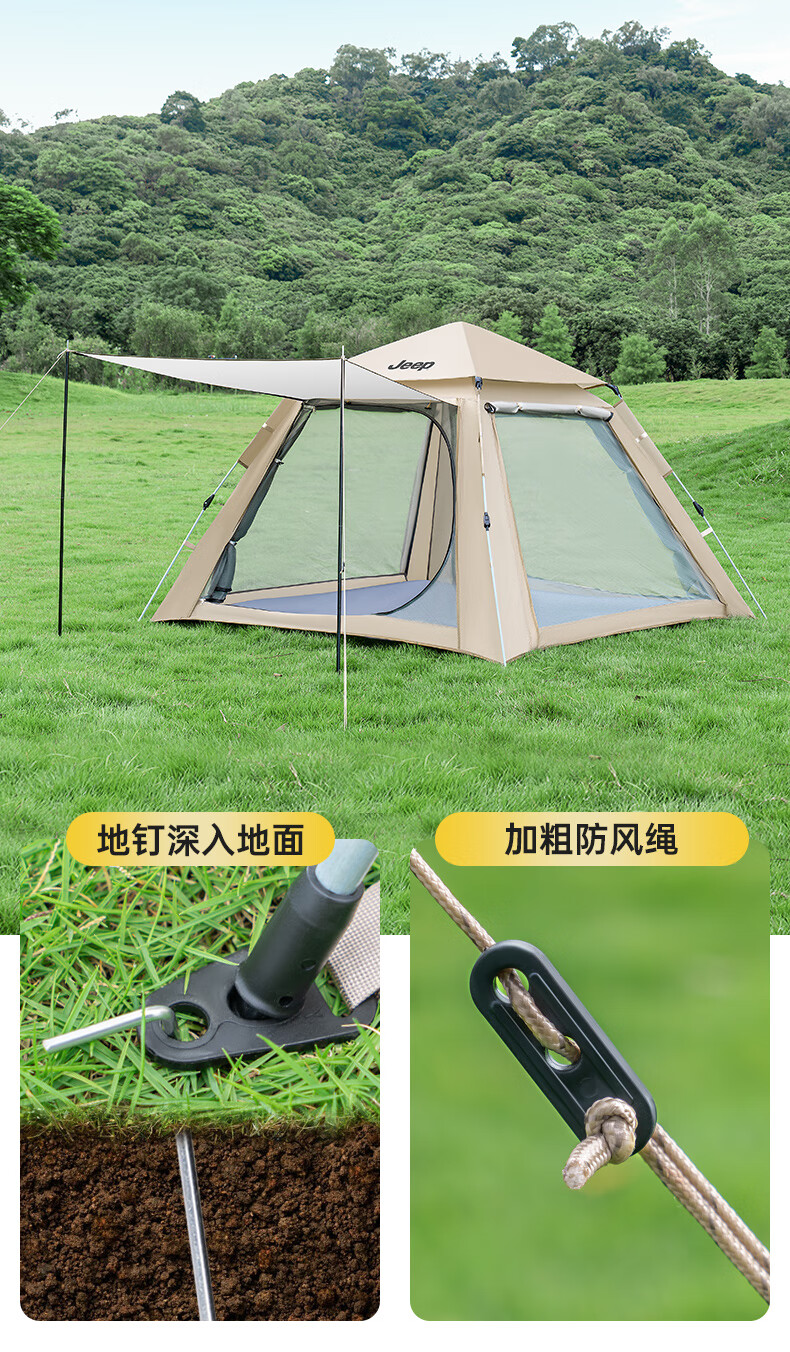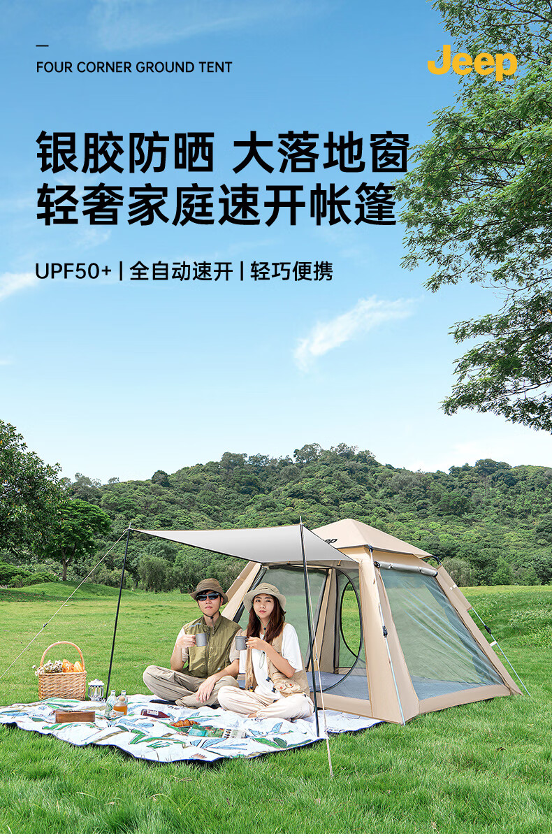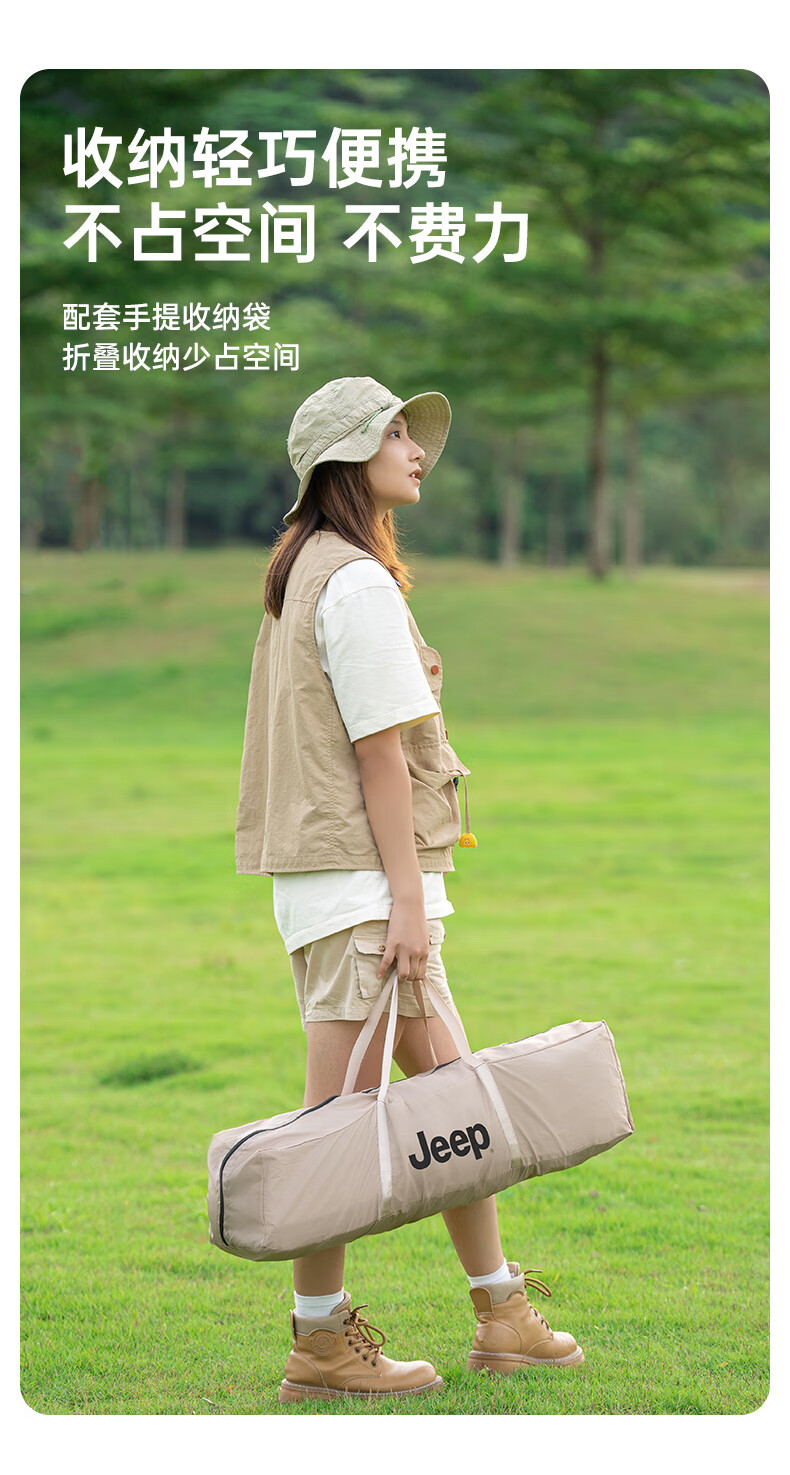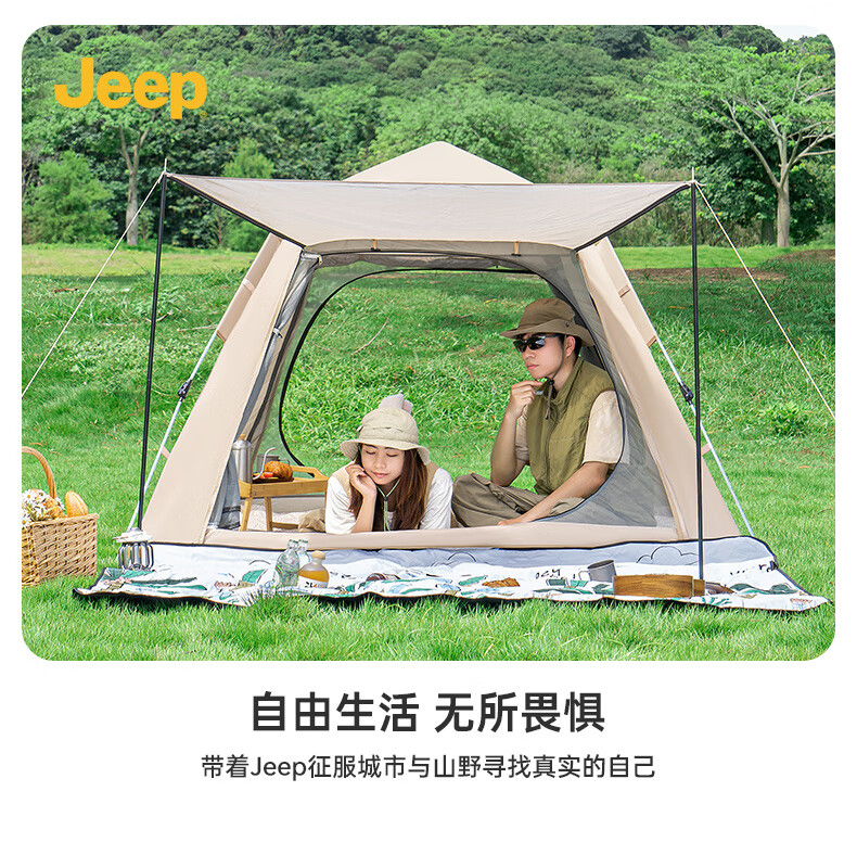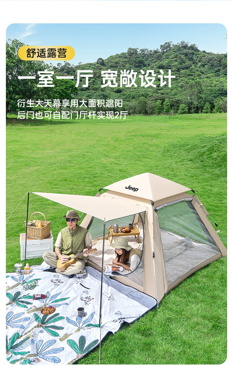 JEEP天幕帐篷户外露营帐篷全自动速开便捷天幕二合一防晒家庭野营装备 大号米白黑胶款套餐2