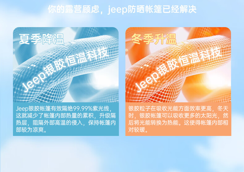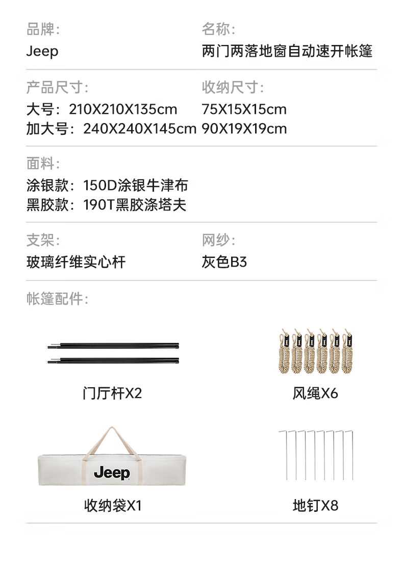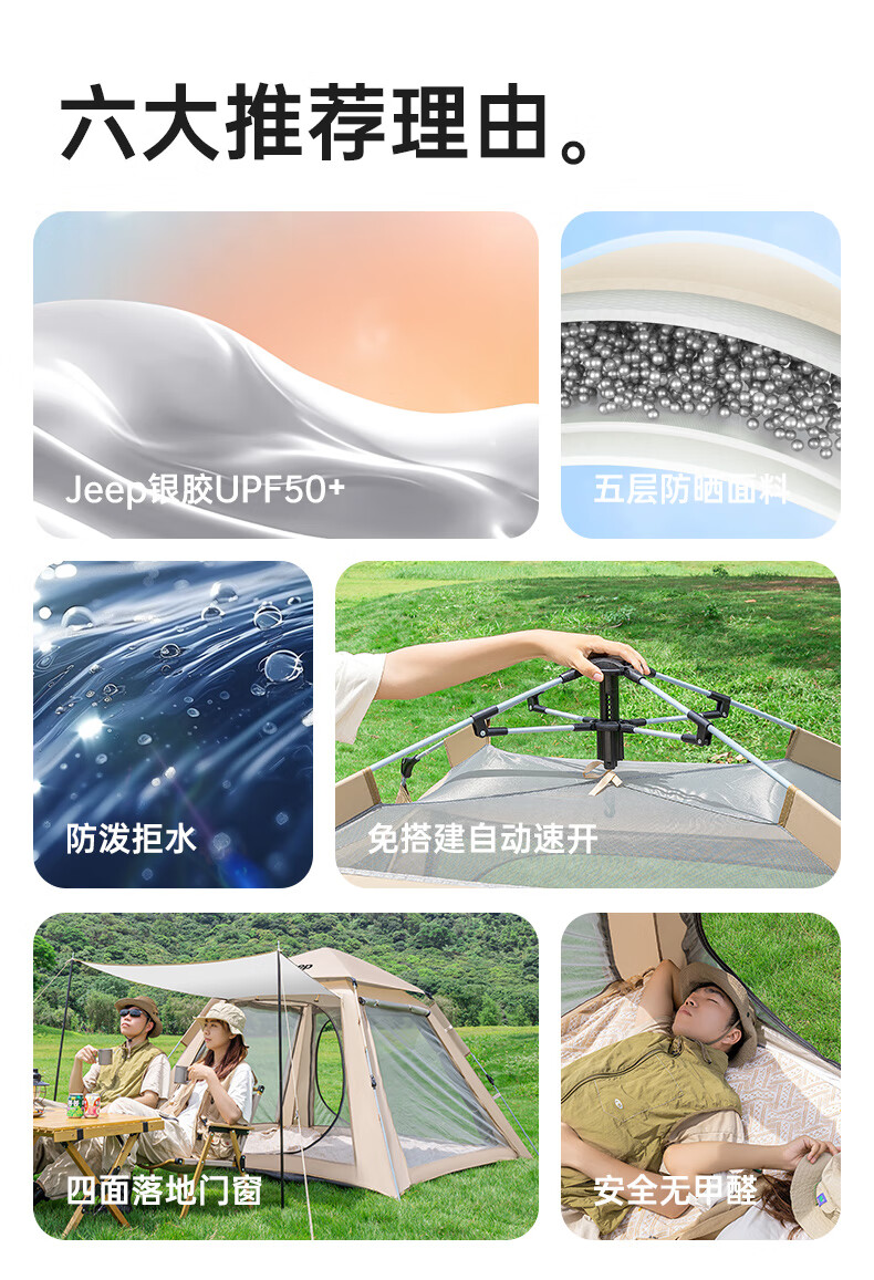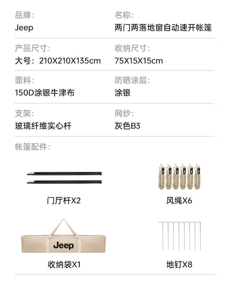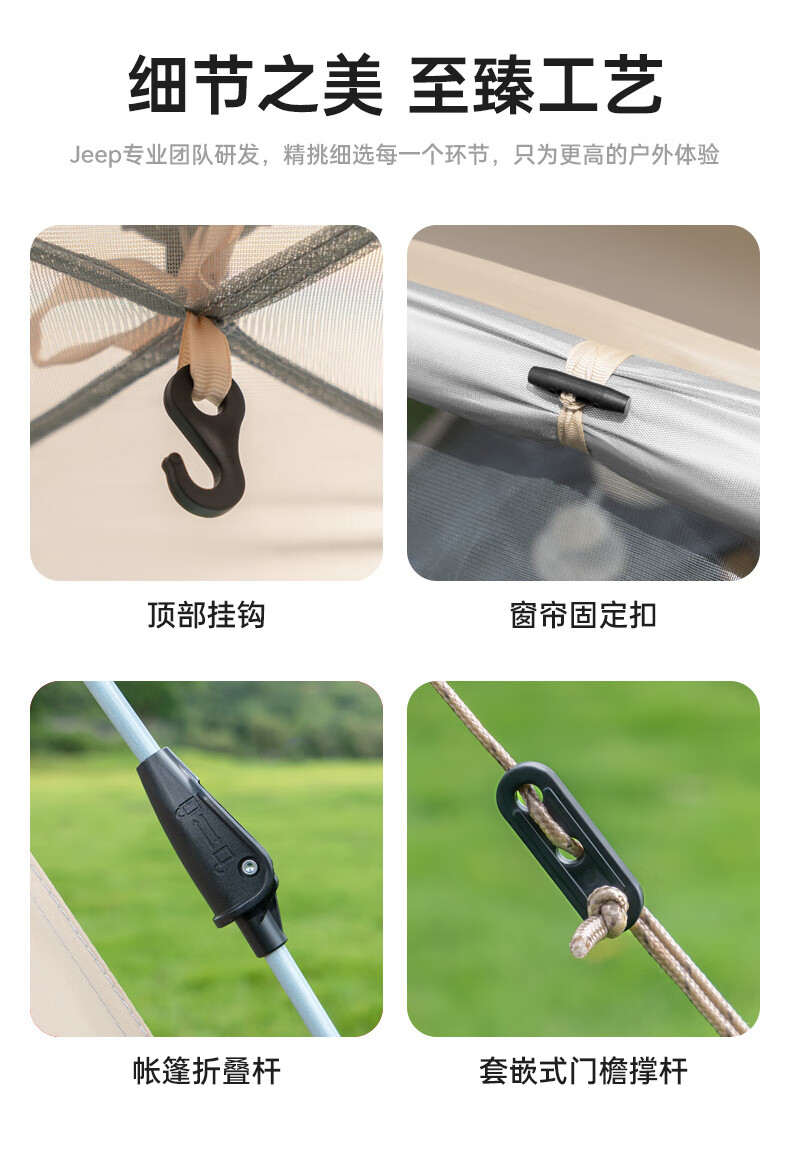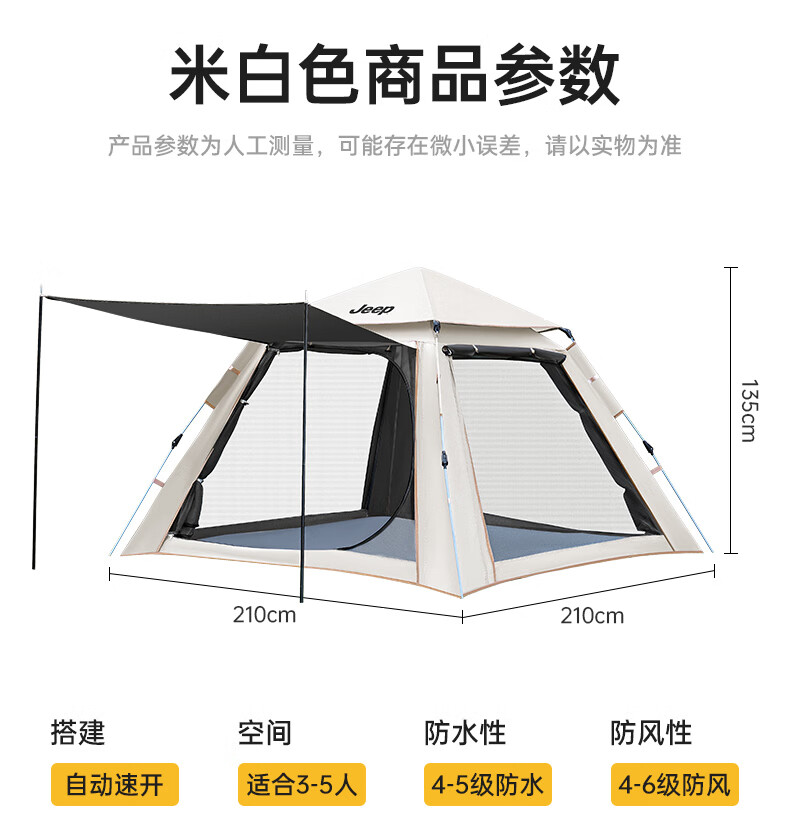 JEEP天幕帐篷户外露营帐篷全自动速开便捷天幕二合一防晒家庭野营装备 大号米白黑胶款套餐2