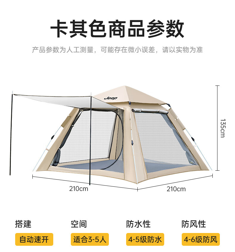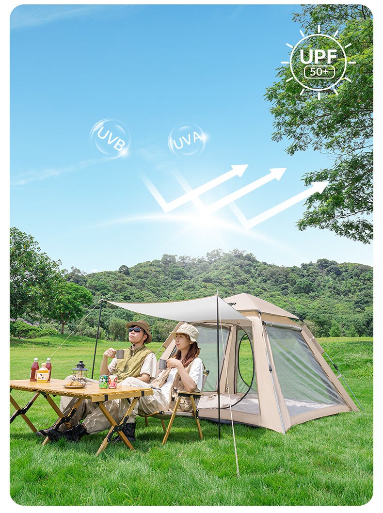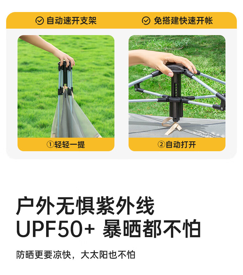 对比了好多家,比较纠结,买的时候有点着急用,特意找了客服问能不能安排尽快发货~结果很快2天就收到了!今天才刚拆封搭着看下样子,操作很方便,4个角撑开就行了,收也简单。开收帐篷全程我一个人就完成了。帐篷也很大~
