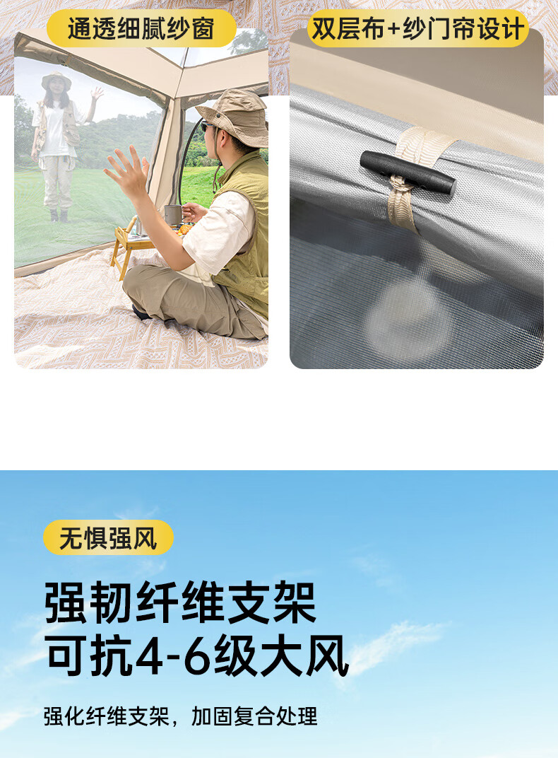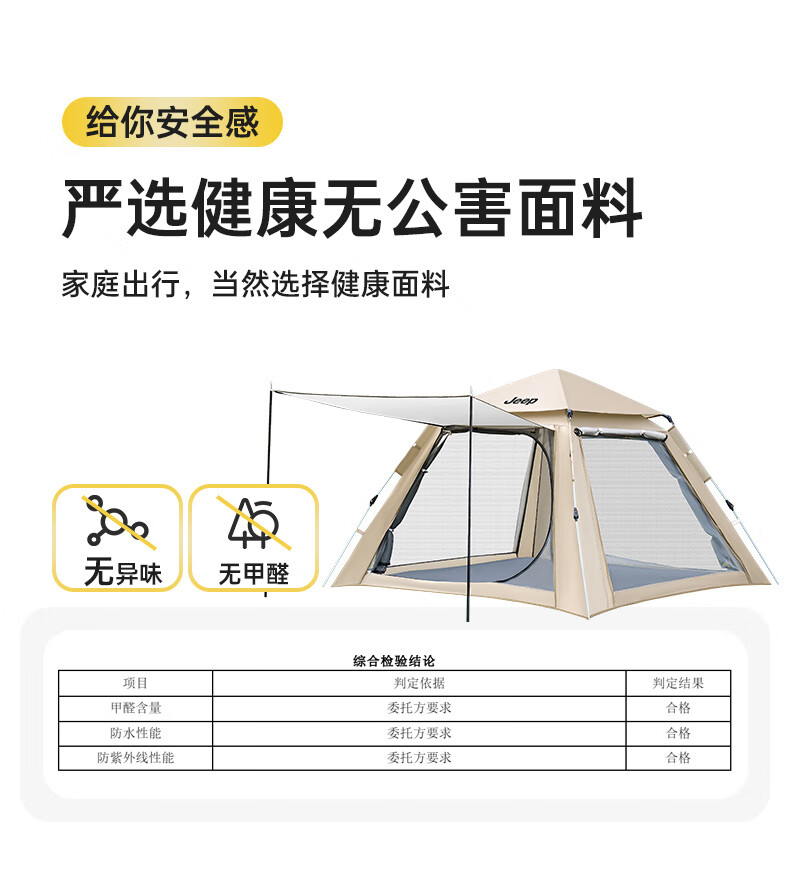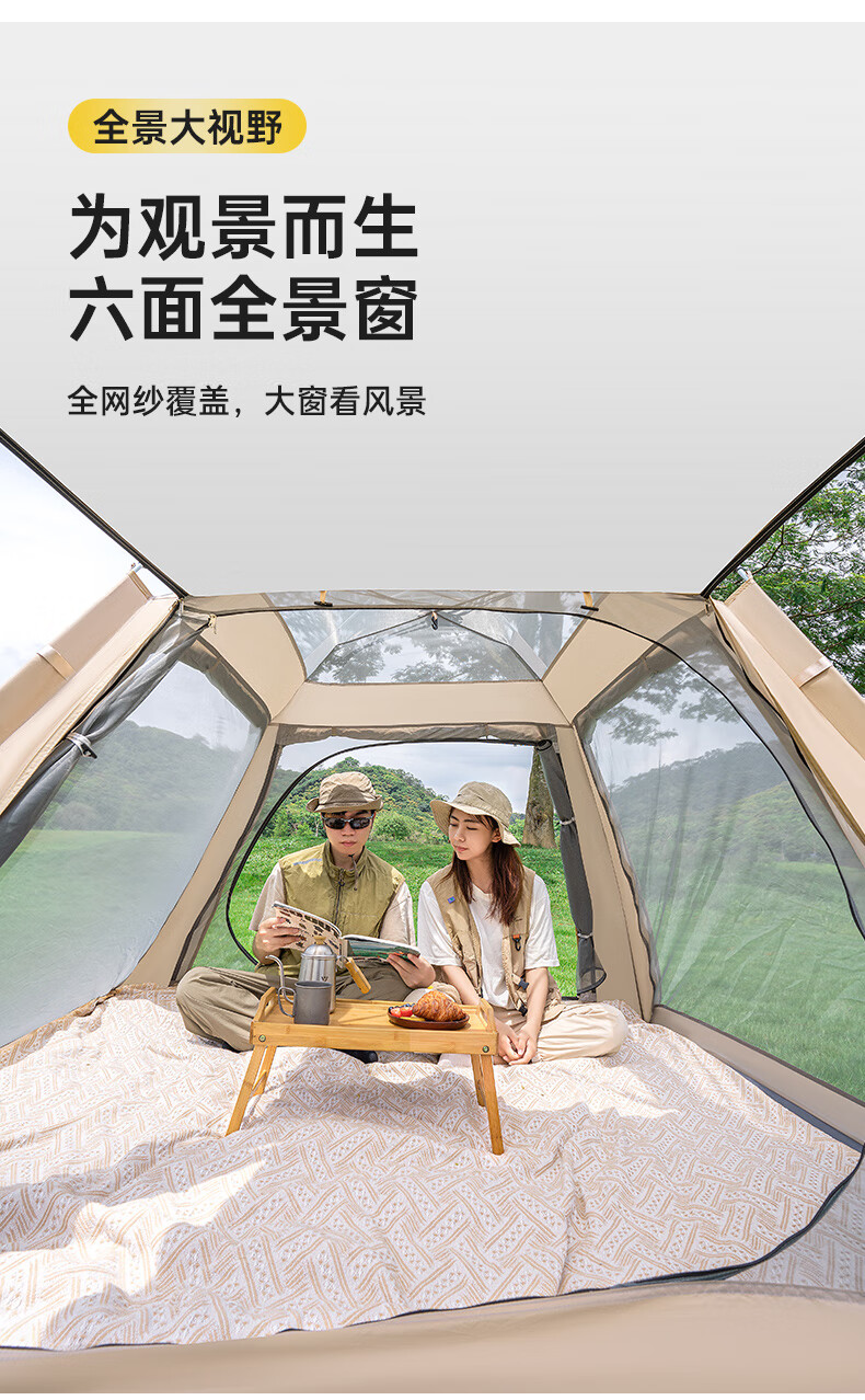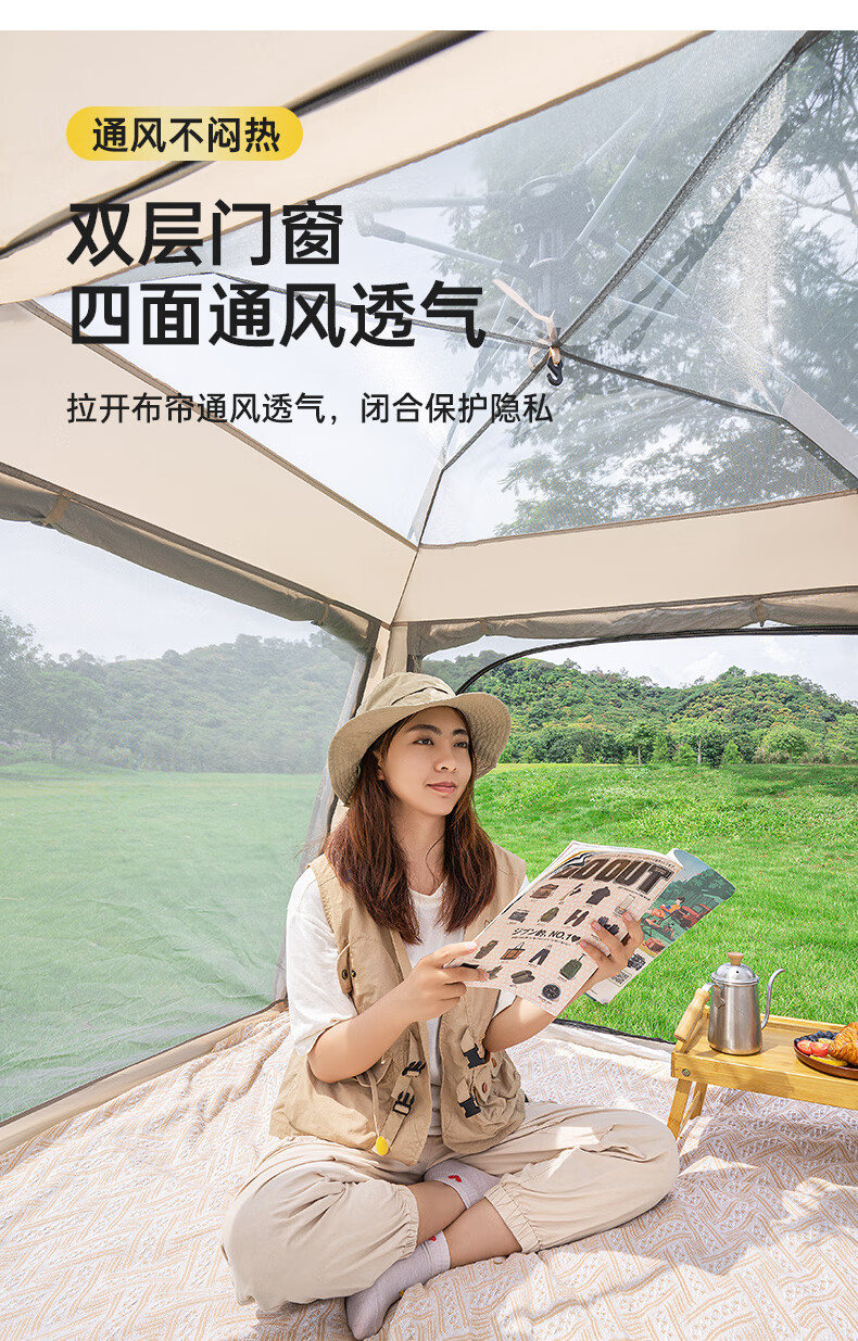 产品功能:非常透气,很实用, 外观材质:正方形容纳量还是挺大的,带个门帘,可以遮补分阳,野餐垫也是这家买的,蛮好的 商品品质:没得说。