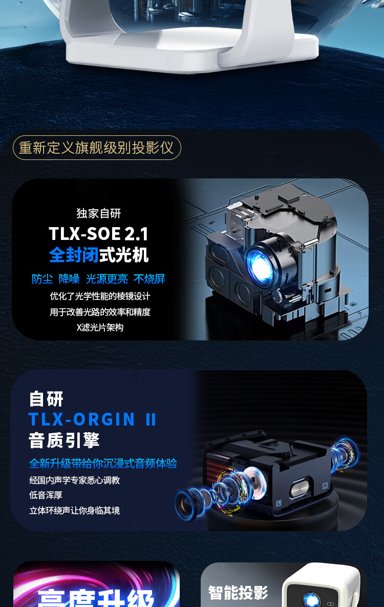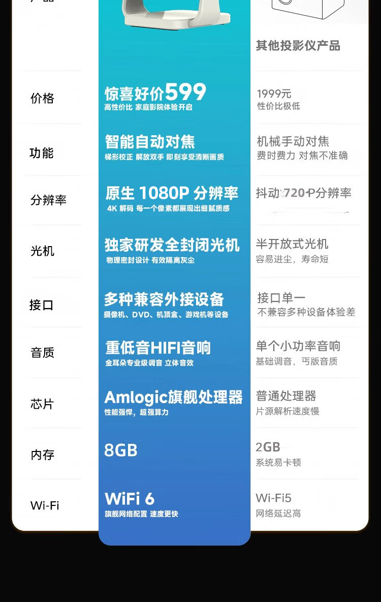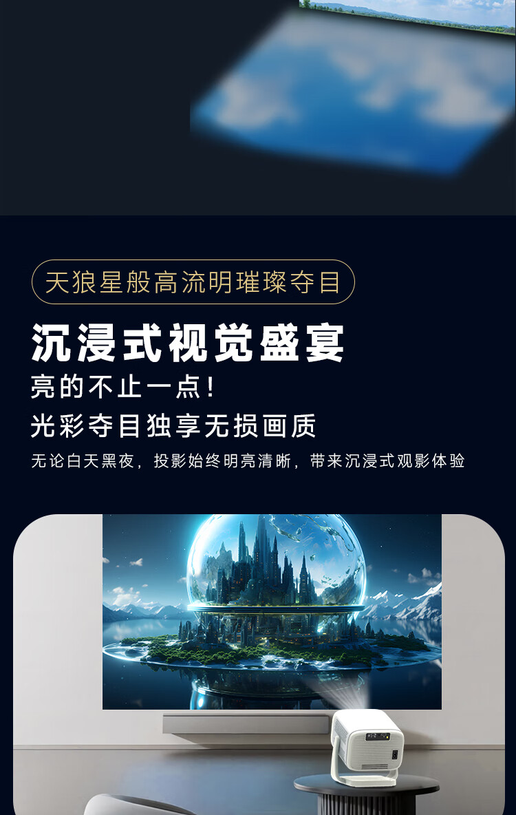 本来担心投影仪操作复杂,结果这款完全不会,外观好看,像个装饰品,清晰度很高,白天看也不模糊,白天没有晚上好,最喜欢晚上关灯在卧室用,完全就是个小影院,自带系统能直接下各种影视APP,很方便