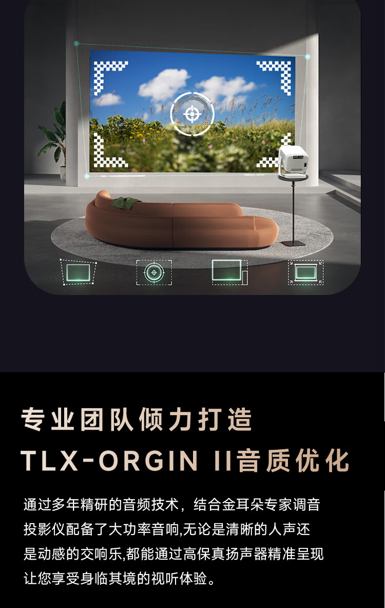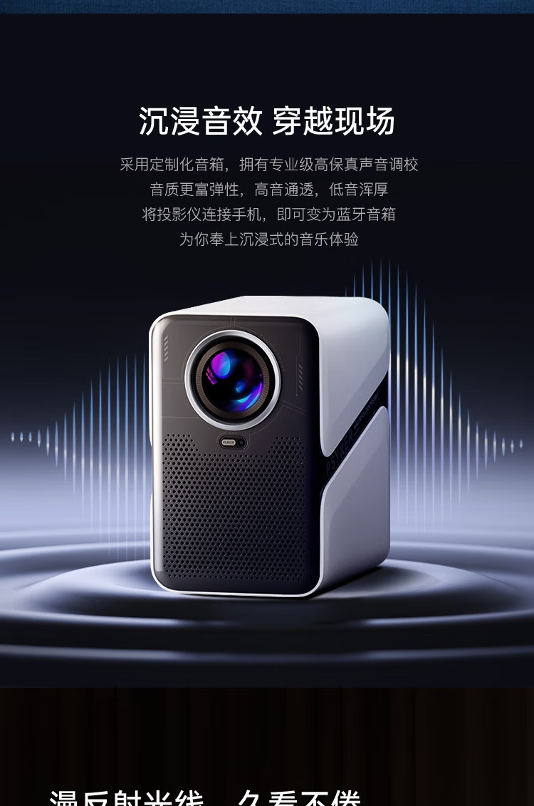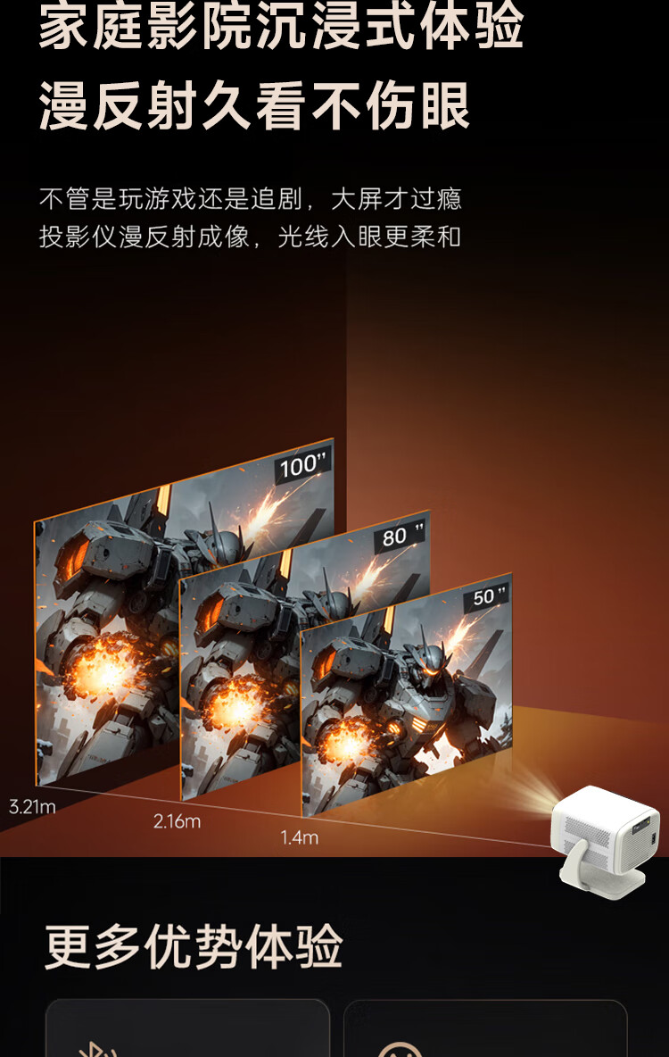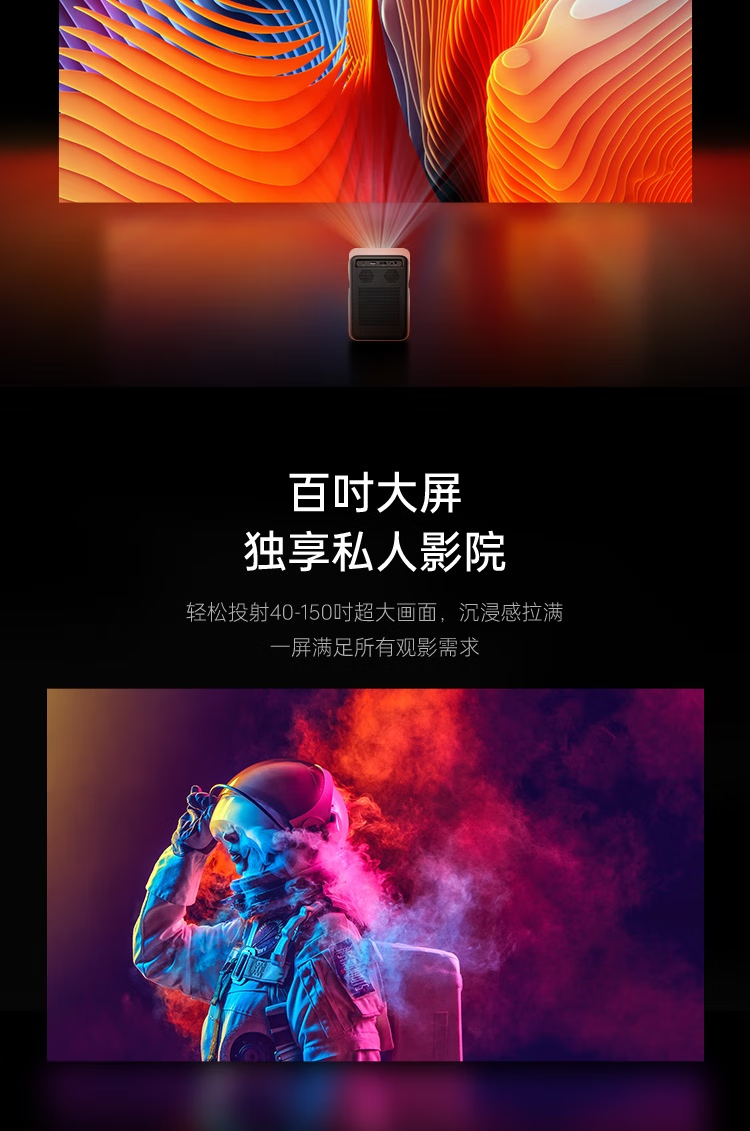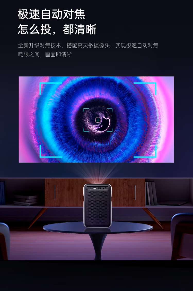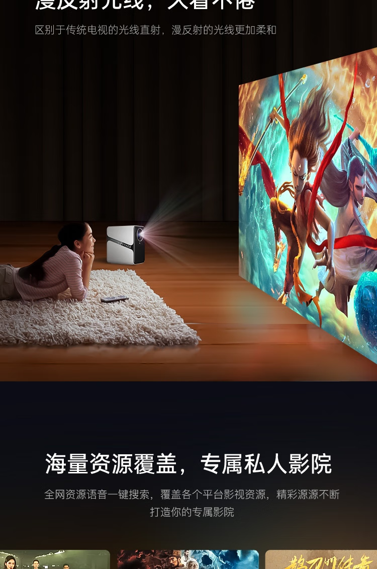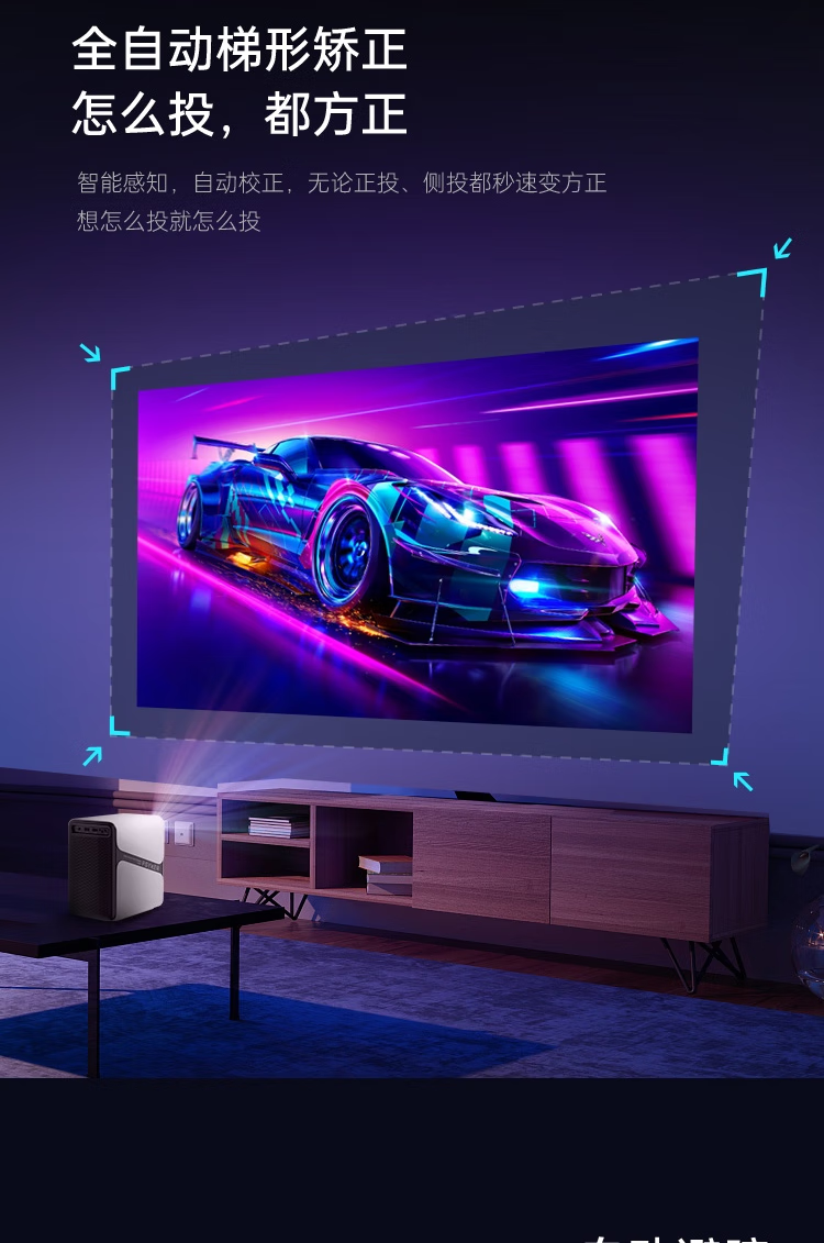 想看什么电影,直接用智能语音搜索,立刻就播放,连打字都省了,它的外观小巧不占地,画面大小可以自由缩放,调到最大也依然清晰,更厉害的是画面四角矫正,就算放在床头柜侧着投,也能自动调出方正画面,真正实现了随心所欲