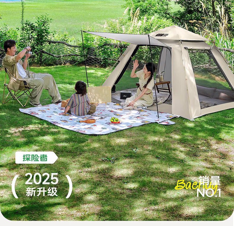 这款露营帐篷真的超出预期!上周带它去了山林露营,搭建特别方便,我一个女生10分钟就搞定了,配件齐全还带详细图解。空间比想象中宽敞,1.8米的充气床垫放进去,旁边还能堆下两个大背包,一家三口住完全不挤。 最惊喜的是防雨性,半夜下了场急雨,帐篷内侧一点没渗水,底部的防水布也很厚实,早上起来地面还是干的。透气性也不错,两侧有透气窗,拉上纱网能防蚊虫,关上又能挡风。收纳后体积不大,塞进后备箱不占地方,重量也适中,拎着走一段路不累。 整体材质摸起来很扎实,感觉能用上好几年,性价比挺高,露营新手闭眼入不踩雷!