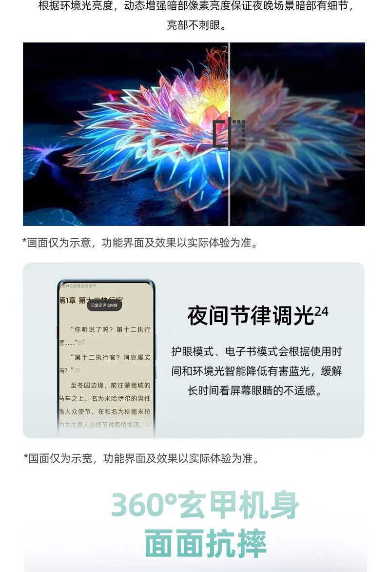 屏幕音效:屏幕大气,曲屏很好。 拍照效果:非常清晰。 外形外观:男女都可以用,长辈也可以用。 运行速度:嘎嘎快。 待机时间:超级长。 买给长辈用的,收到货惊艳了,手机好看也实用,新品,爱了爱了。