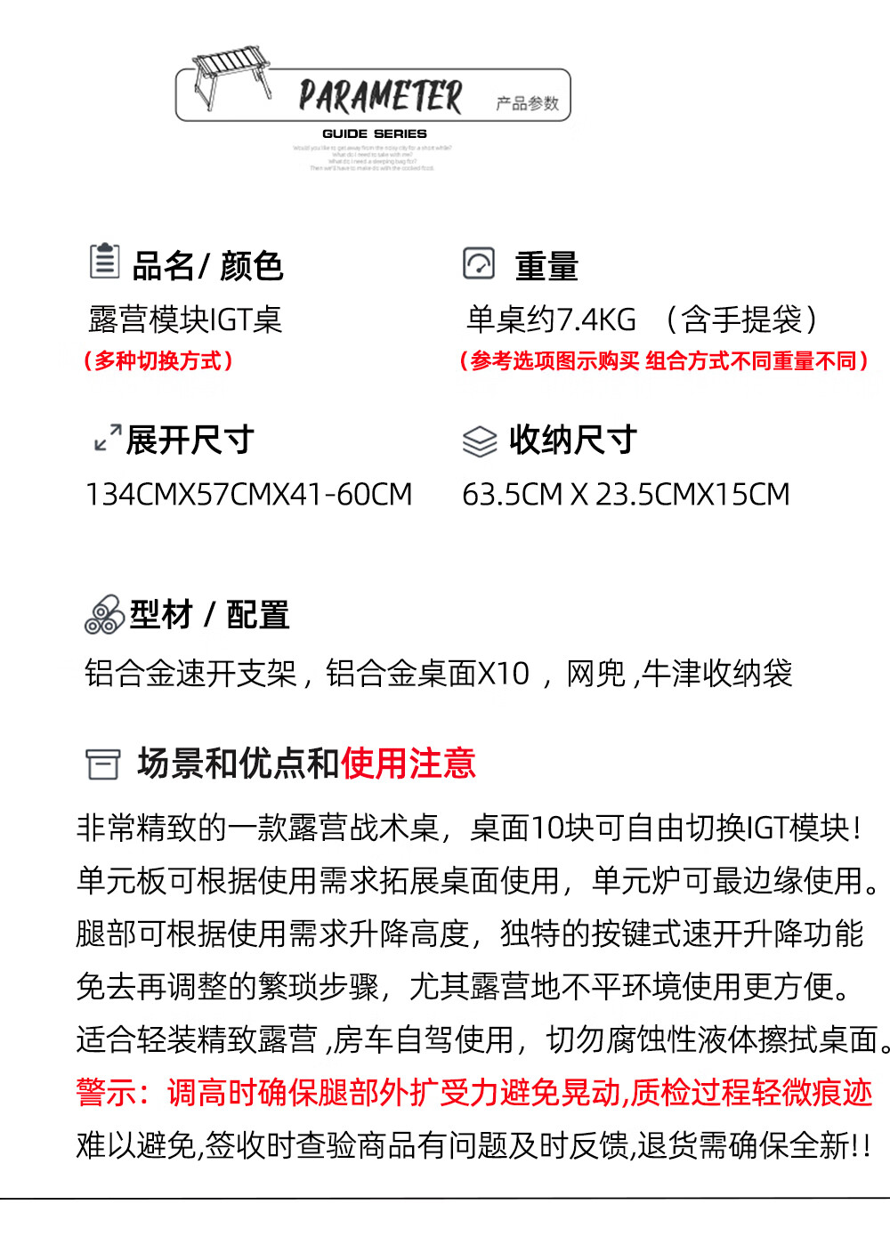 Guide Series户外铝合金露营桌五单元IGT模块野餐折叠桌028桌 BL-028单桌 (均含储物网兜)
