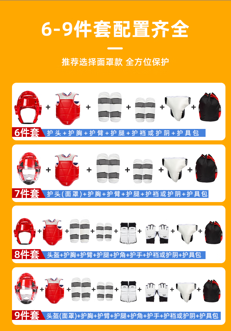 迈高登跆拳道护具全套防护具服护头盔儿童六九件套护甲面罩实战装备训练 6件套【身高110-130cm】1号红色
