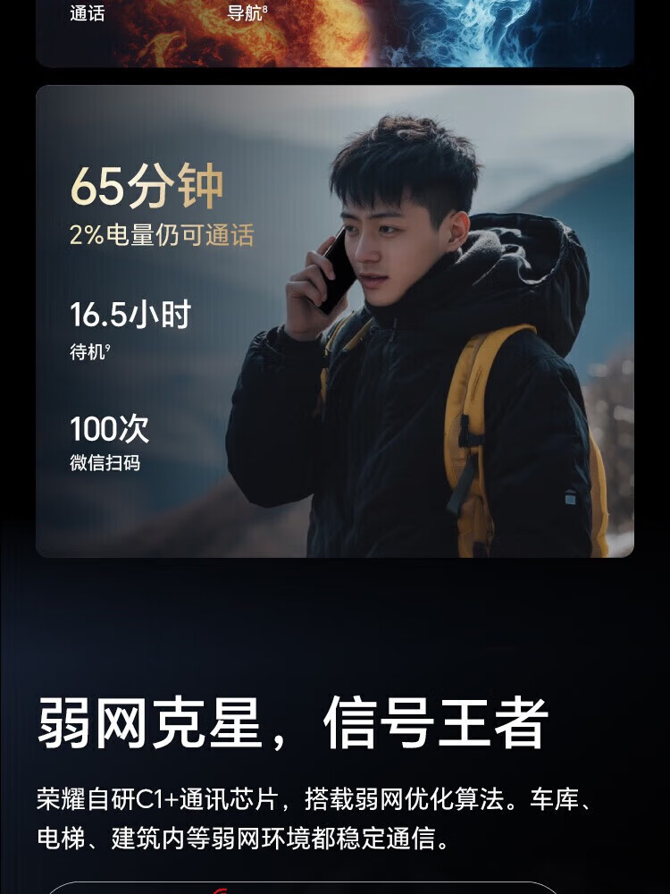 挑选了很久,对比了华为畅享70x,最终选定了荣耀power这款手机,电池容量足够大,彻底解决续航焦虑,外放声音足够大,能达到300%。此外,导航定位非常精准,超强通讯芯片在地下车库等信号弱的地方也能通讯,还有高端机才有的卫星短信功能,是性价比超高的一款中端手机
