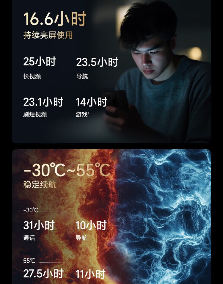 新款Power搭载8000mAh青海湖电池,支持18小时重度使用和66W快充,早上出门到现在一直在用还有81的电,一天一充绝对没问题,工作需求大量使用手机,系统也比之前的丝滑很多