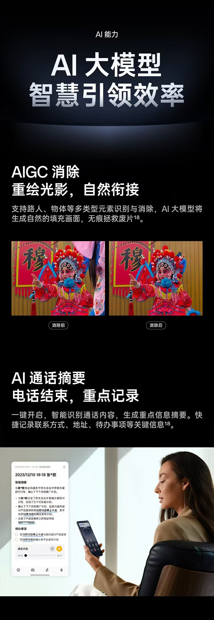 AI大模型,卫星通话,轻薄,LTPO屏幕,高频PWM调光,全焦段影像,潜望式长焦,无线充电,NFC,红外遥控,大底主摄