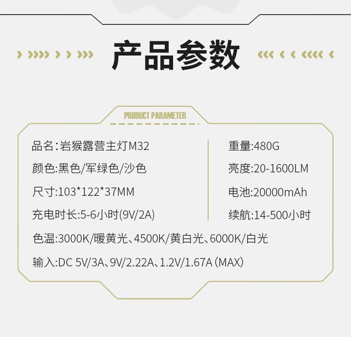 ROCK MONKEY岩猴M32户外露营主灯20000毫安大容量露营灯长续航超亮 露营主灯-军绿色【20000毫安】
