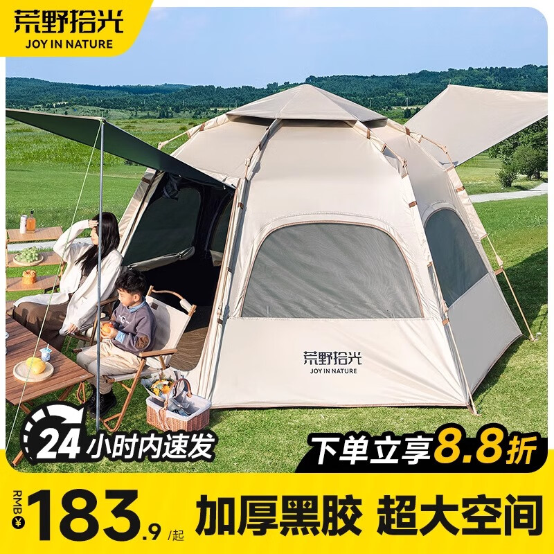 荒野拾光帐篷户外折叠便携式露营野餐过夜秋冬装备全套自动速开黑胶防晒 黑胶【两门四窗】3-4人+防潮垫