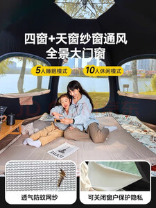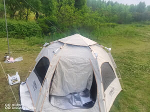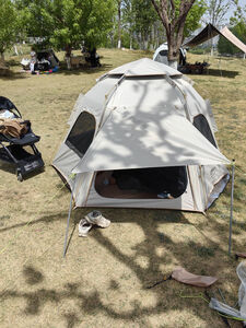 同时下单了两个帐篷 一个探路者一个这个 价格差不多 明显这个质量好一些 内空间很大 睡四个大人没问题 开合很简单提起来一下子就好了 送了防潮垫 性价比很高哦 好评推荐 防水效果:目前没测试 适用场景:公园/野外 容纳人数:4大1小 透气效果:六角躲避太阳找风更灵活 展开类型:六角 便携性能:很轻巧 可单手拎走