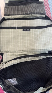 到手手感感觉还可以,出去旅游一个人容量够用,也不会很占位置。这个材质应该是轻微防泼水,内有防水层可以放毛巾和牙刷。