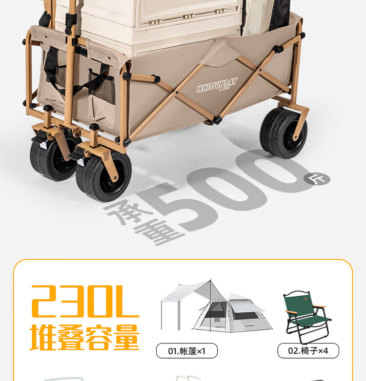WHITSUNDAY疆屿户外折叠露营车第一名摆摊可升降桌儿童可躺旅行野餐沙滩推车 卡其7寸轻便款120L【全钢车架 实心万向轮】
