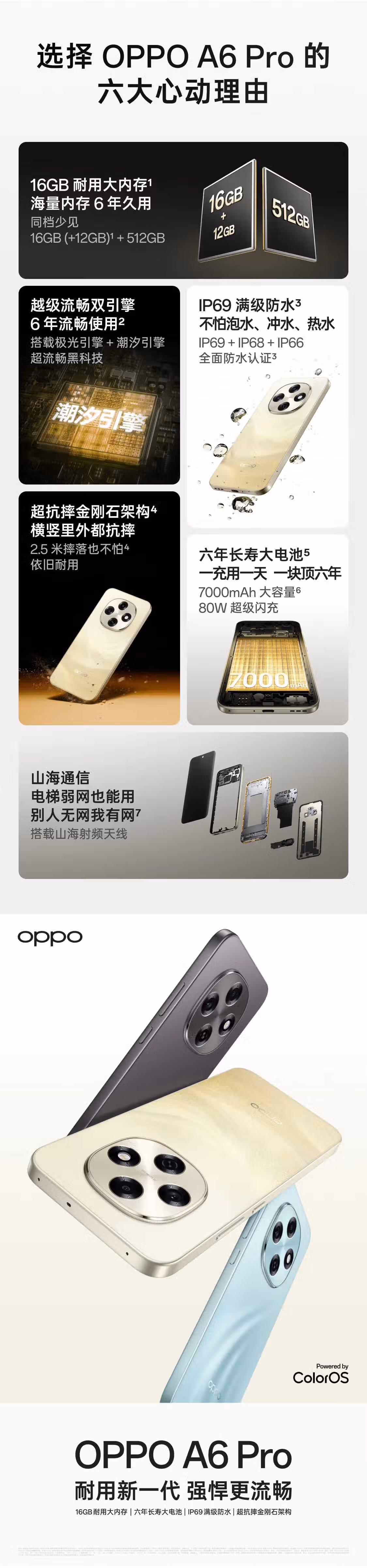 OPPOA6 Pro 越级流畅双引擎 7000mAh大电池 IP69防水 5G耐用 NFC 新品手机 选12期/24期 免息 流水生金 16GB+256GB【全网通5G】 官方标配【季度碎屏险+晒单选好礼】