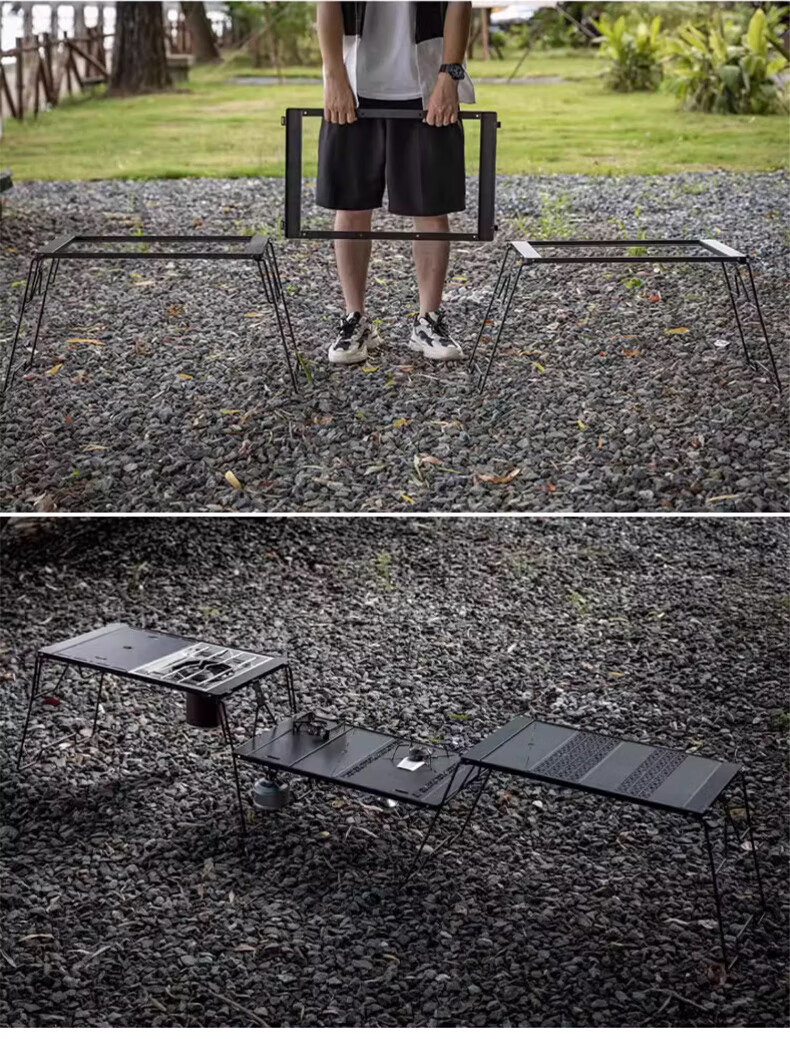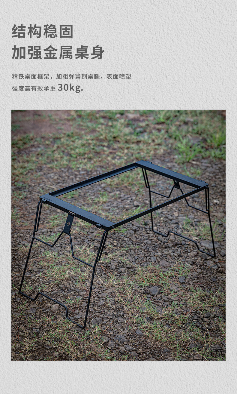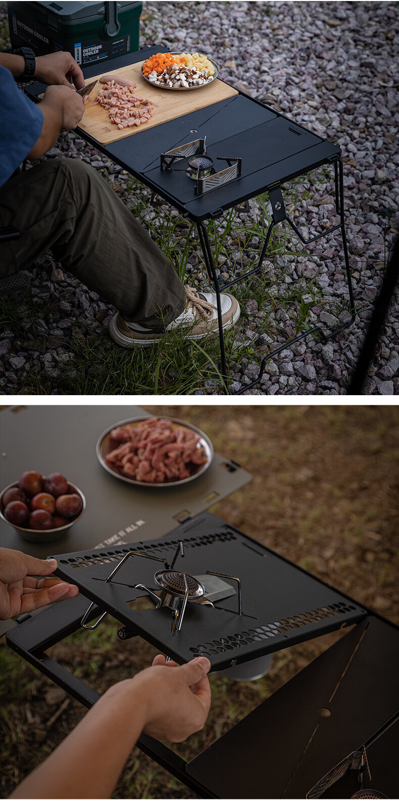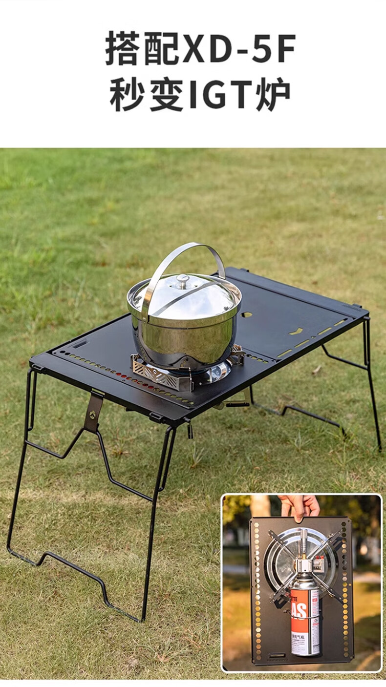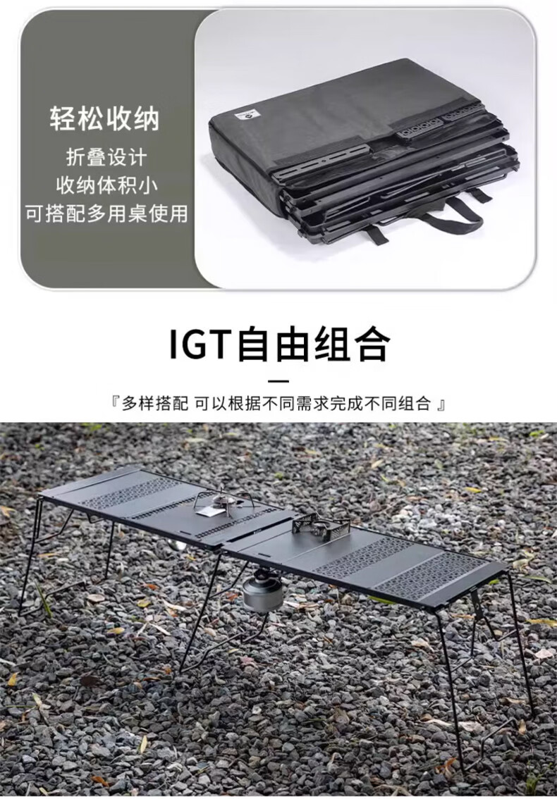 铁质的二单元igt便携小桌架,重量对一般男人来说,虽比铝合金的重,但拎起来一点不费事。整体质量很不错,但有一处质量小问题,客服也尽快给解决了。我现有的爱路客的igt炉子可以平整嵌入,但路客的一单元茶盘由于两家设计问题无法融合,请根据照片来理解