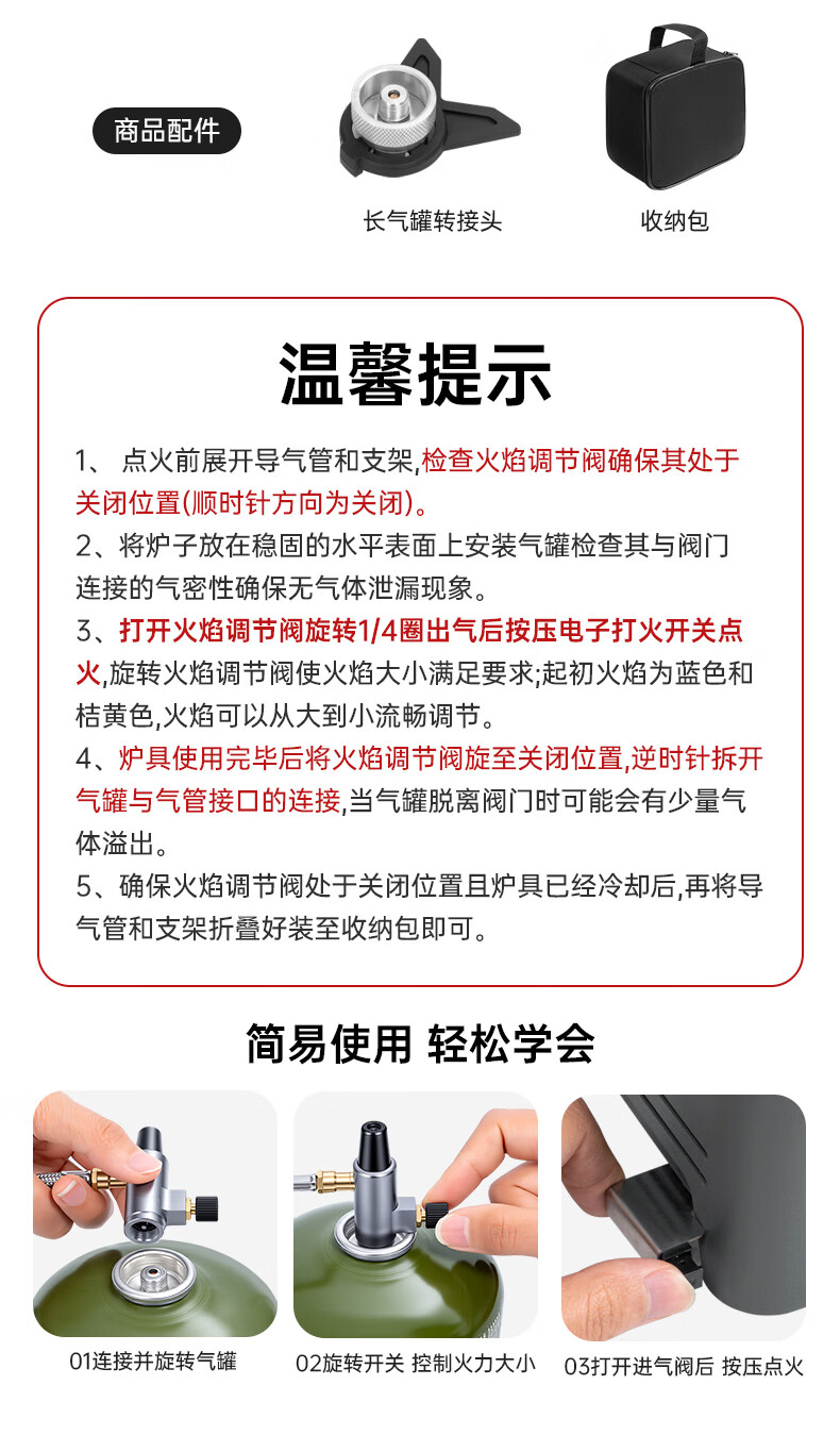 收到火后,迫不及待的打开试用,火力非常的强劲, 续航时长:一瓶气可以烧很长时间 火力大小:活力大小调节非常方便 适用场景:这下烧烤,火锅都不成问题了 产品做工:很精致 重量大小:非常轻巧,拿取方便