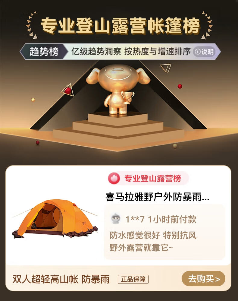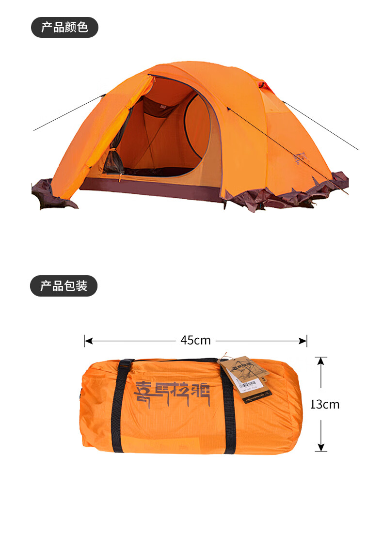 对比了很多家,也在~上做了攻略,喜马拉雅的帐篷是很专业的,买了这个三根杆加宽防暴雨的,空间感确实很大,透气性很好,小三个人的大空间,质量做工都是一流的,颜色很靓丽很好看很适合登山使用。
