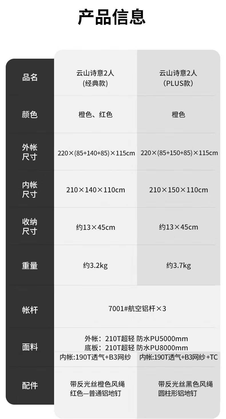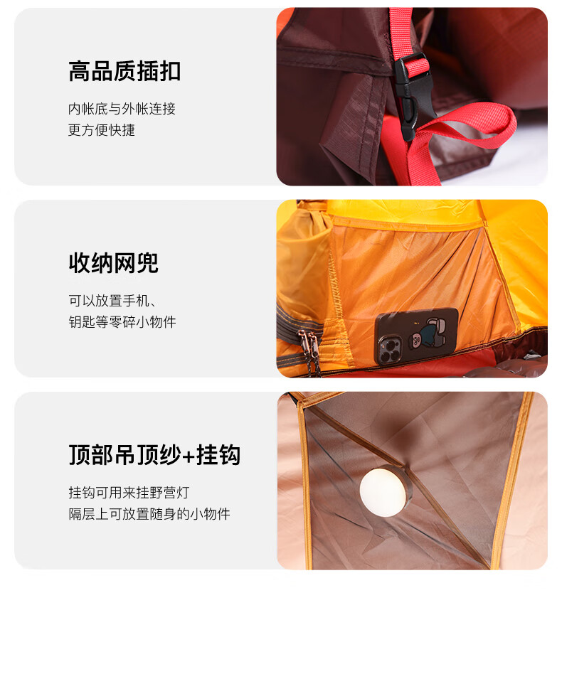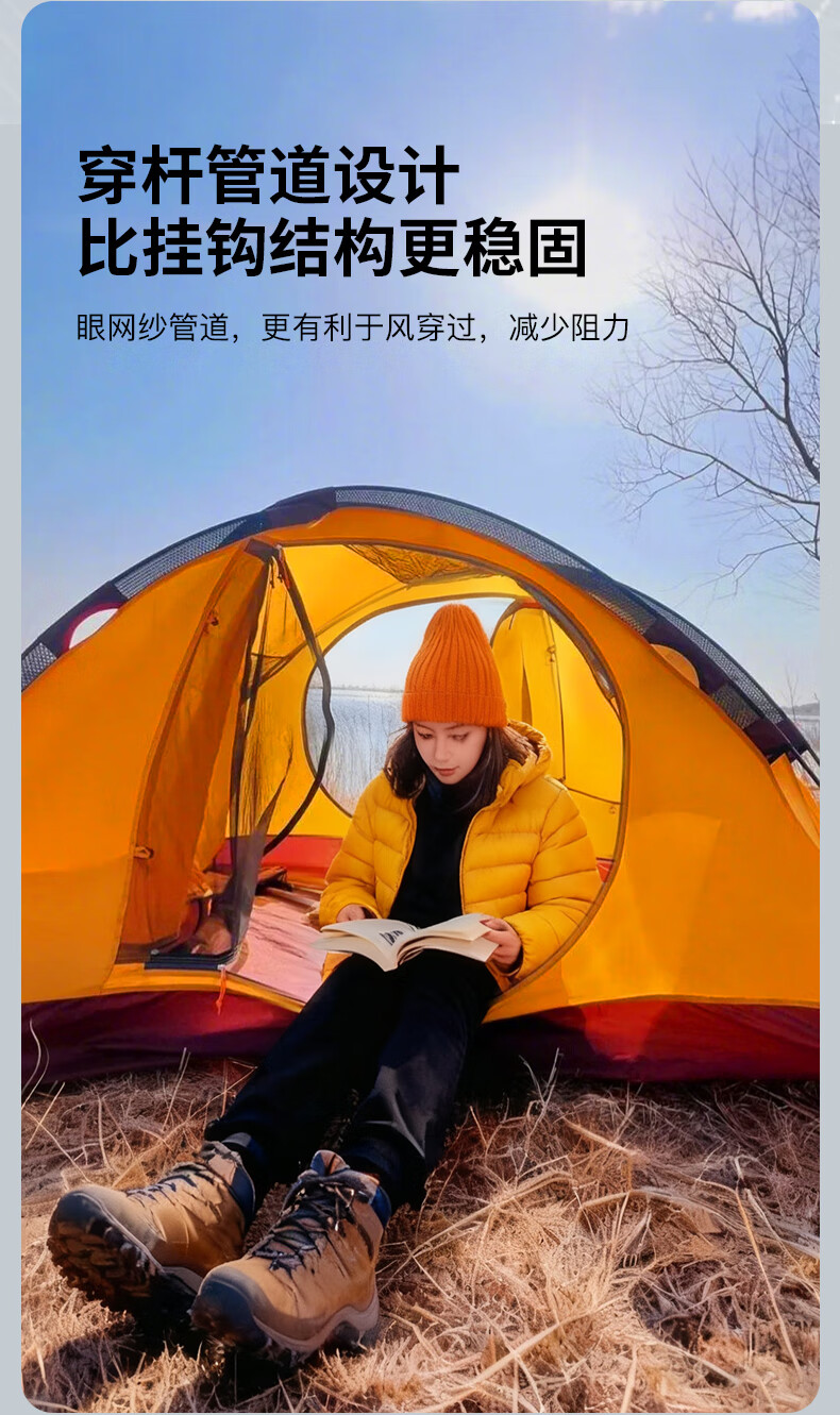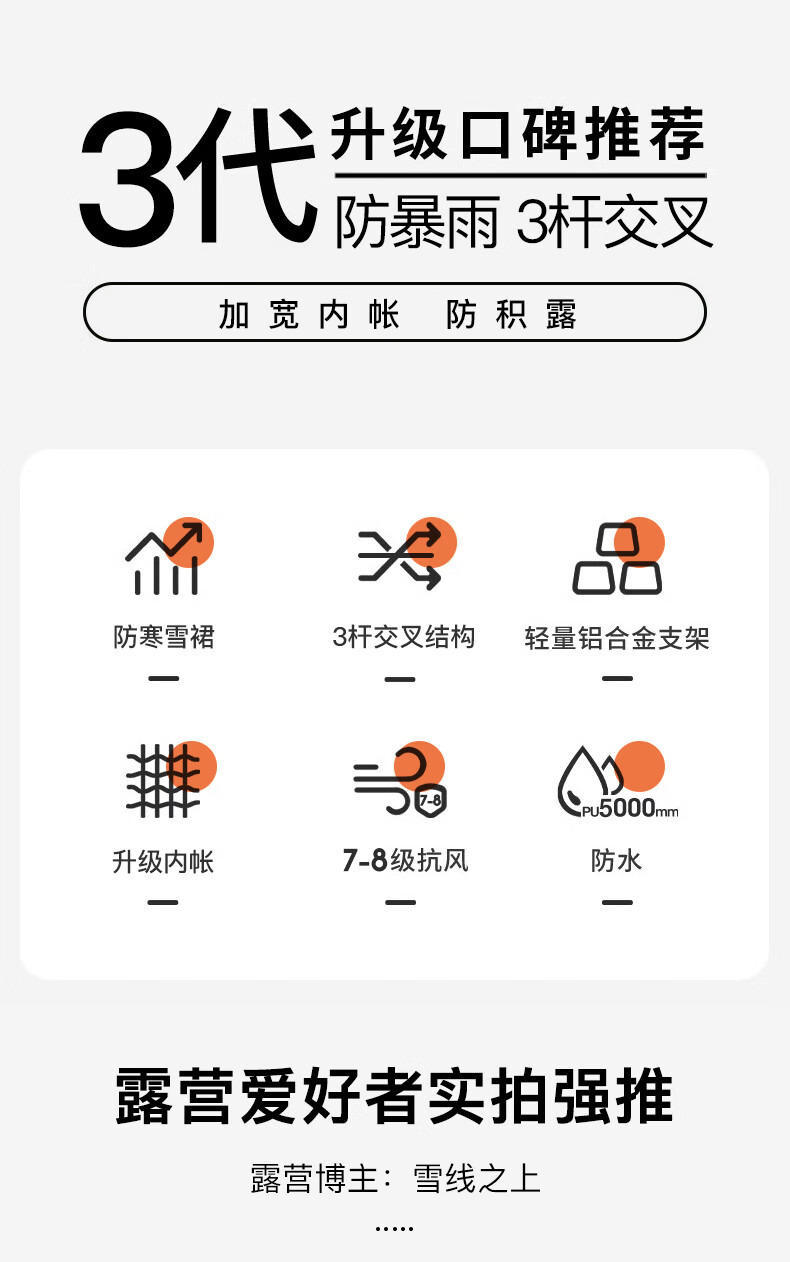 买一款小型的帐篷,还有必要轻量化的携带和方便,事实上我已经有三个帐篷,但是这款小帐篷的属于小帐篷的比较大的感觉很不错,最关键他是小帐篷里的性能搭建和材质等各个方面我感觉都很不错,买完之后出了点小插曲,但是客服很快给解决了,很满意,非常感谢今年五一带着她去度阴山