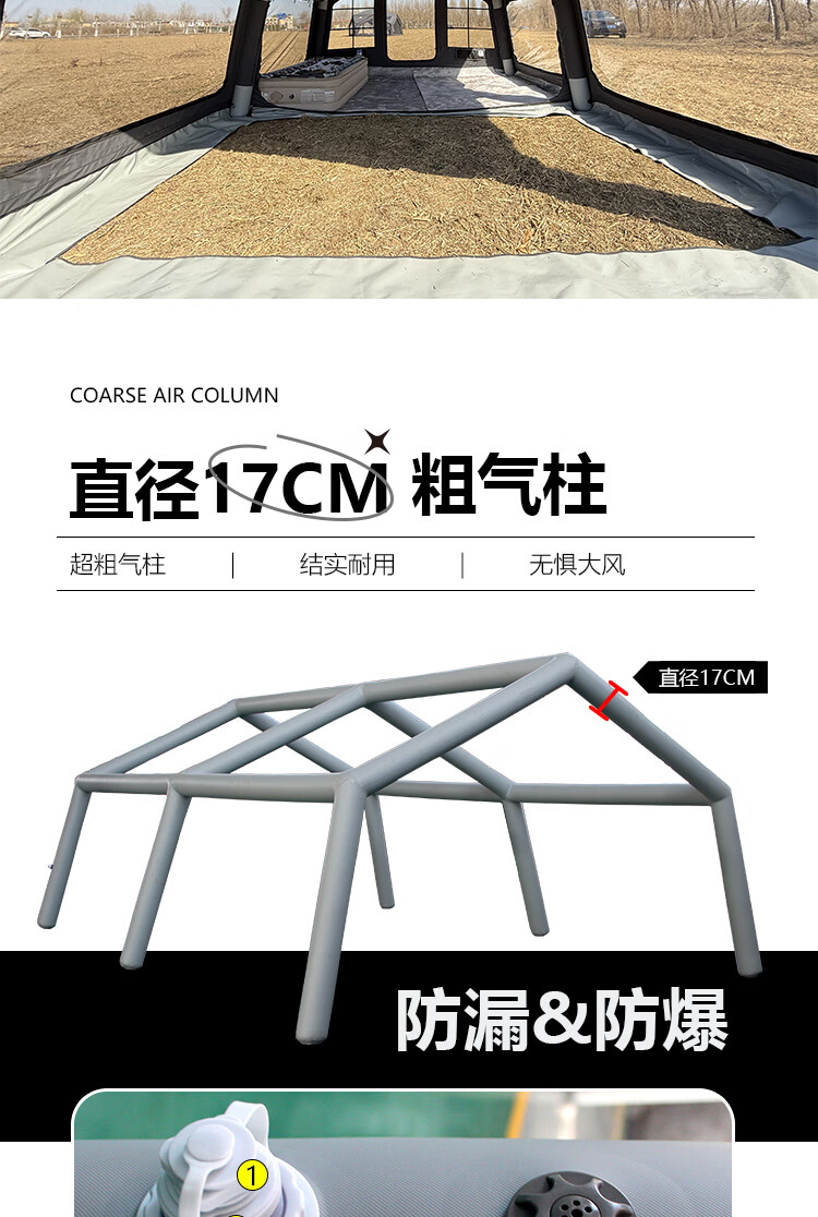 这款充气帐篷真是露营小白的福音!以前最头疼的搭帐篷环节,现在变得超简单,只需打开气阀充气,几分钟就能稳稳立起来,彻底告别了繁琐的穿杆和捆绑。内部空间非常宽敞,几个人待在没有压力,还能放下气垫床和行李;顶部的立体设计让头部空间很充裕,一点不压抑。它的防雨防晒能力也很出色,涂银面料能有效隔热,暴雨天帐内也保持干爽,安全感十足。通风窗、防虫网和内部储物袋这些人性化细节,让户外过夜既方便又惬意。收纳起来体积小巧,轻便易携带,真正实现了轻松露营的梦想。