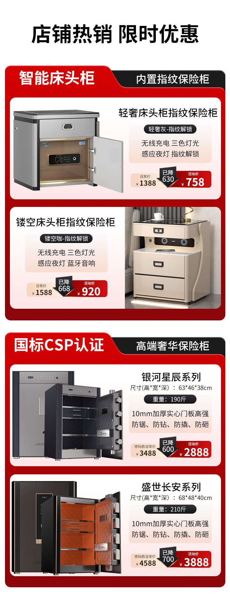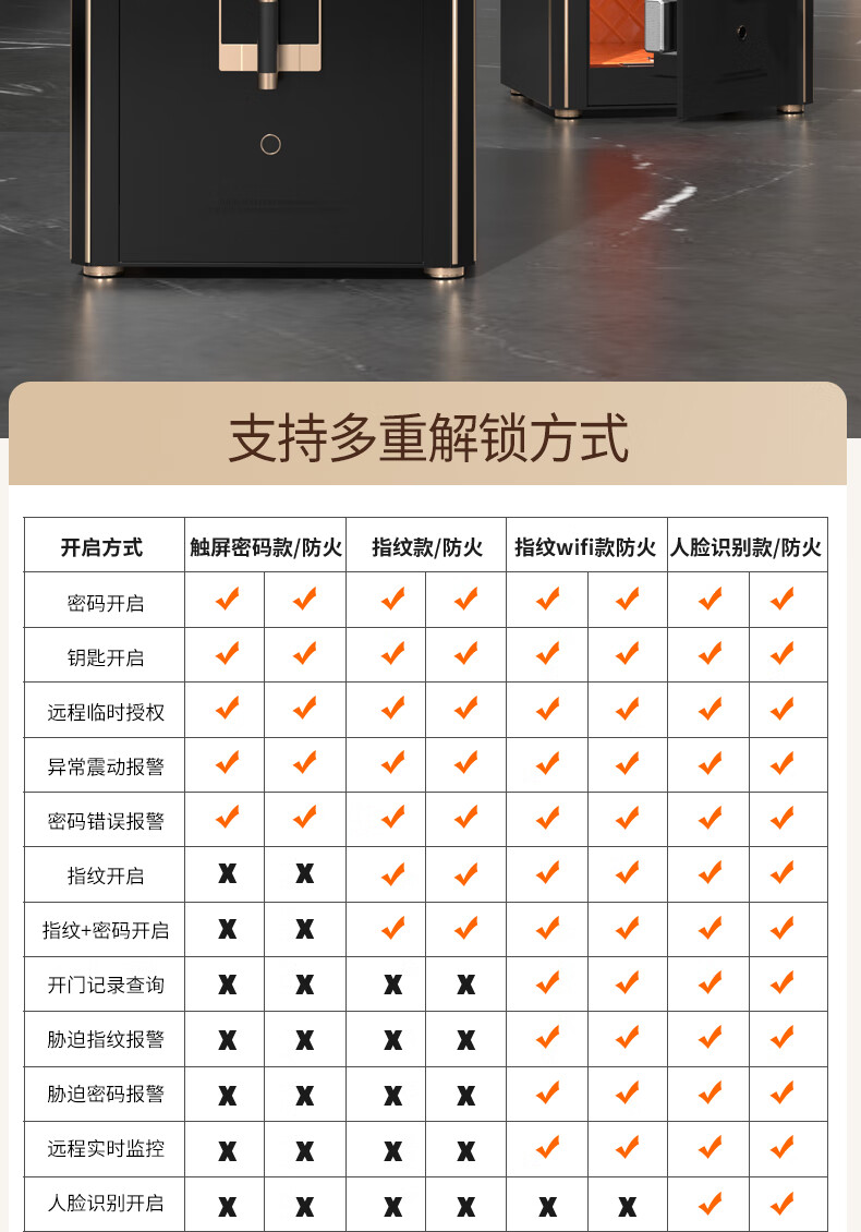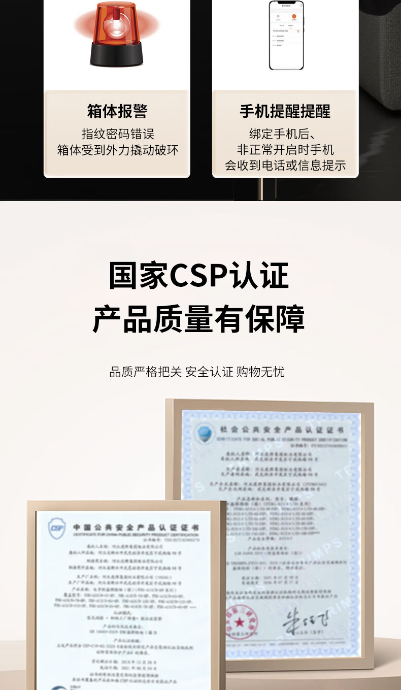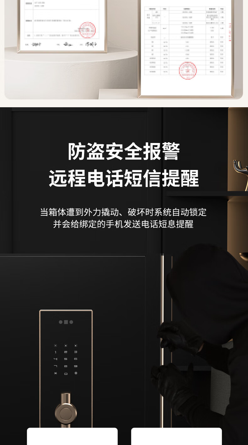 东西不错,到货快包裹扎实,分区科学,内锁蛮好,随箱配了电池,问了客服改密码的方法,有外接电源万一没电也可钥匙双开,整体推荐购买