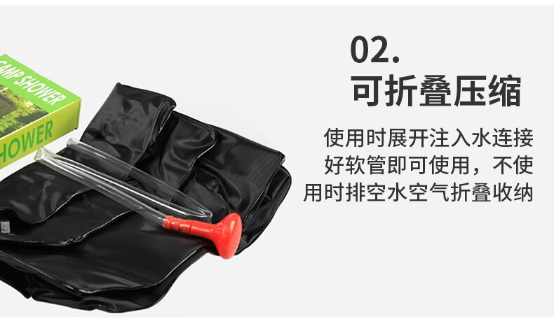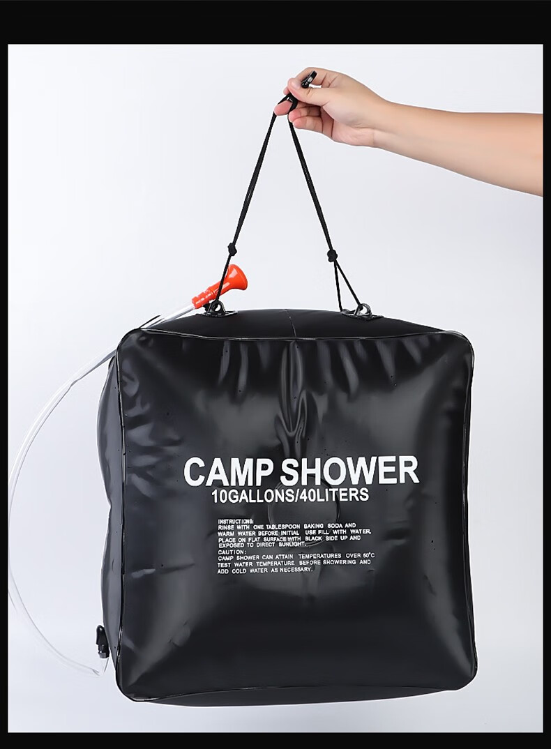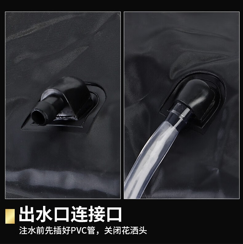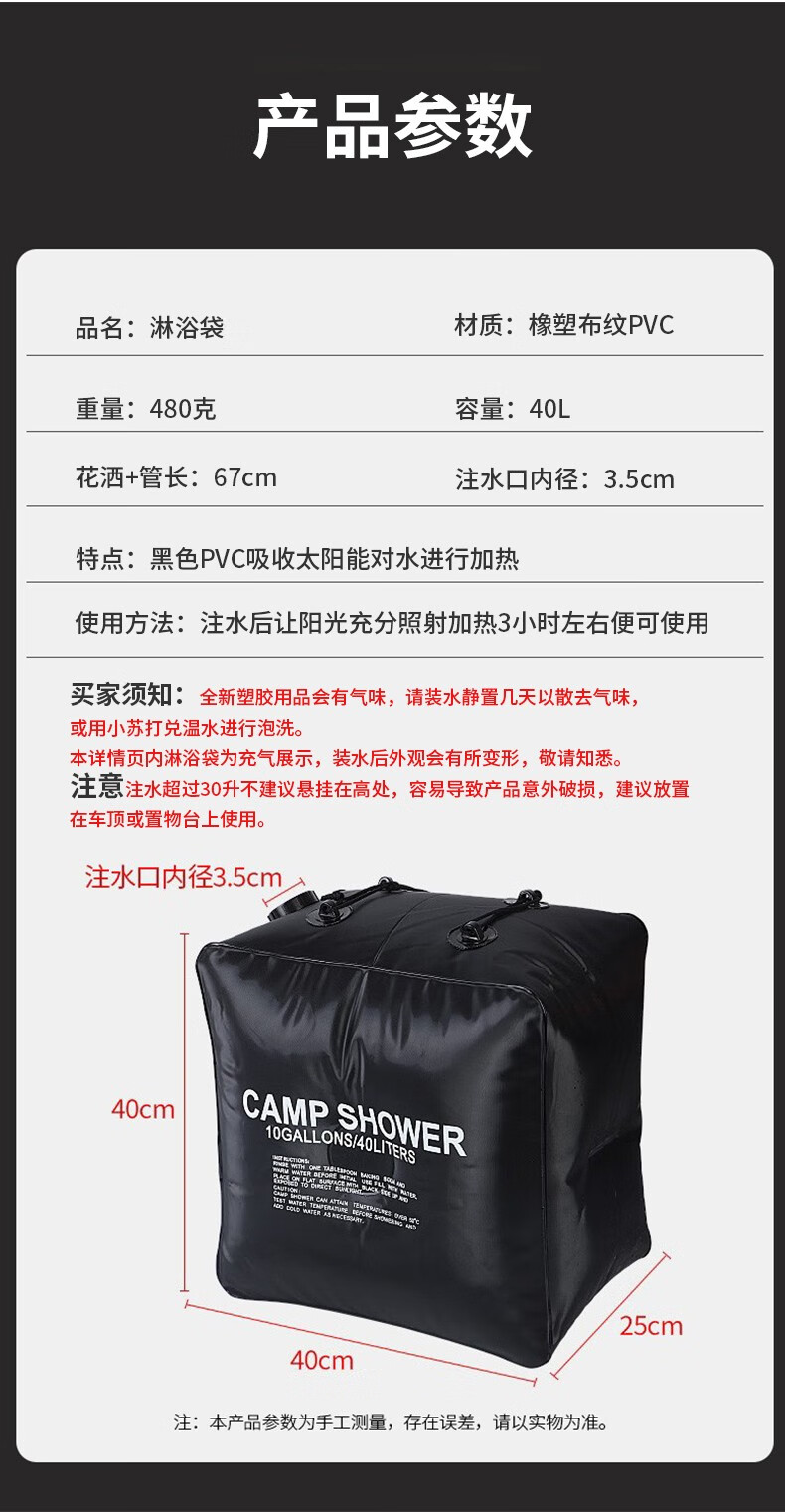 户外淋浴袋收到了,很大一个,配有花洒,装上水晒上二三个小时,就有热水用了,真方便