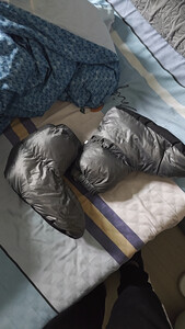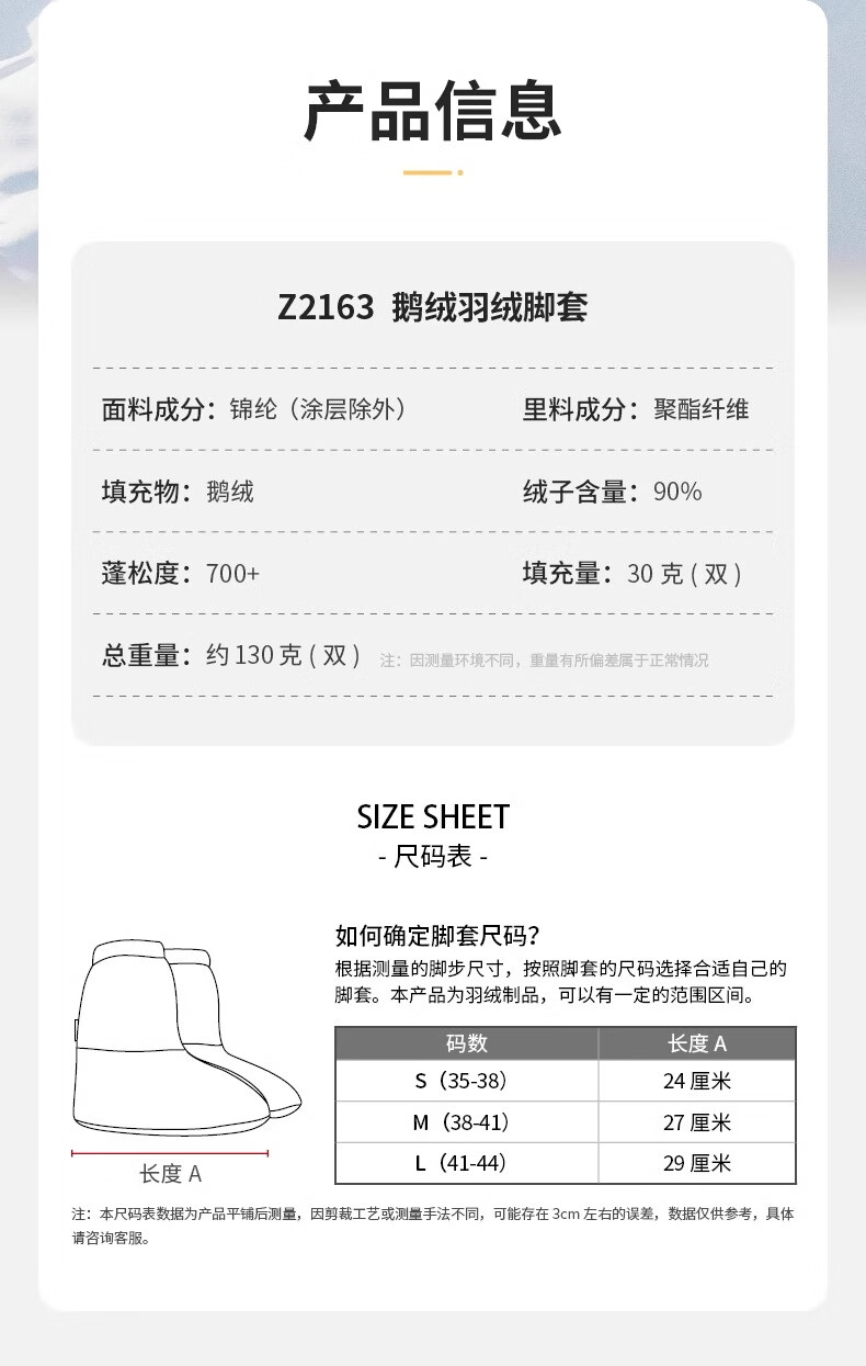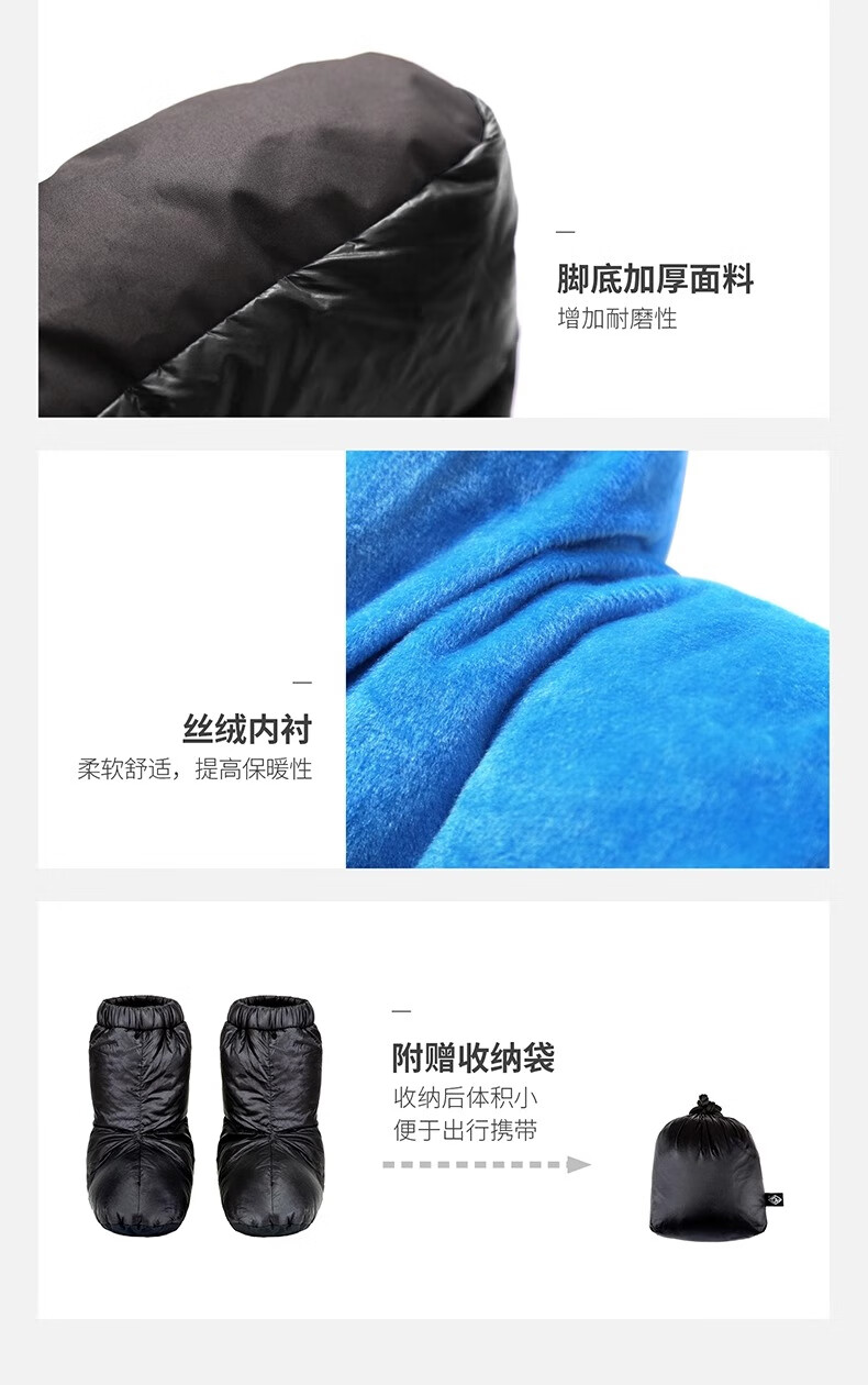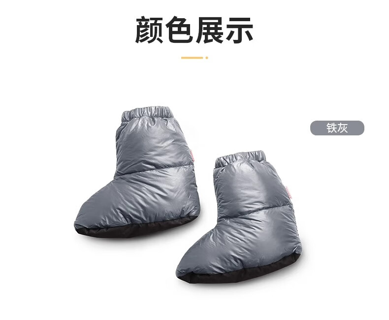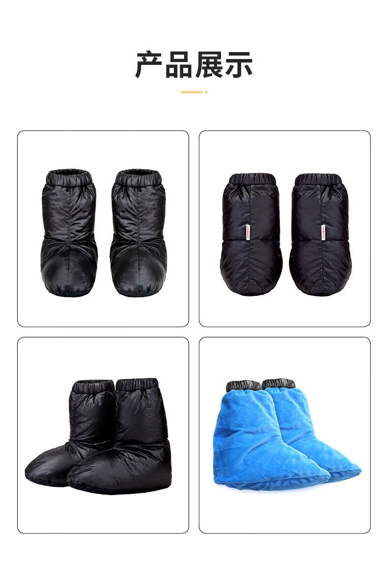 注:本品为羽绒脚套,也叫帐篷鞋,没有硬质鞋底,不可以穿着在地面上行走。