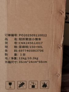 按时送达,车很重。很结实,拉着媳妇从家到车库,很丝滑,收合打开多练几次也就熟练了,就是这个颜色吧不耐脏,要是迷彩或者深色就好了。家里露营设备都是这家的。