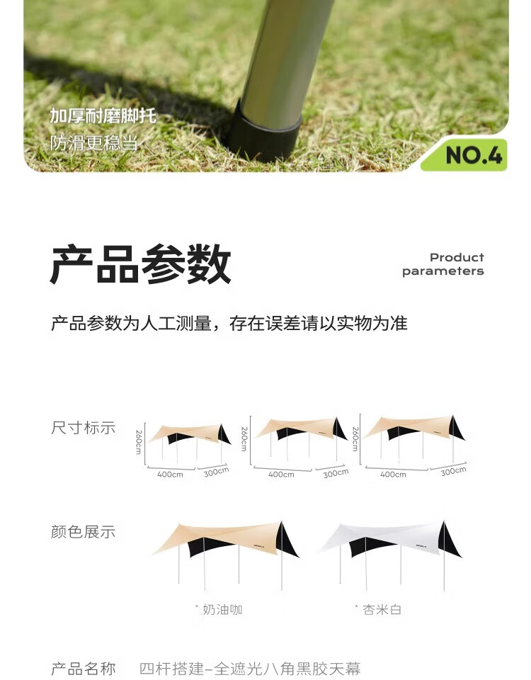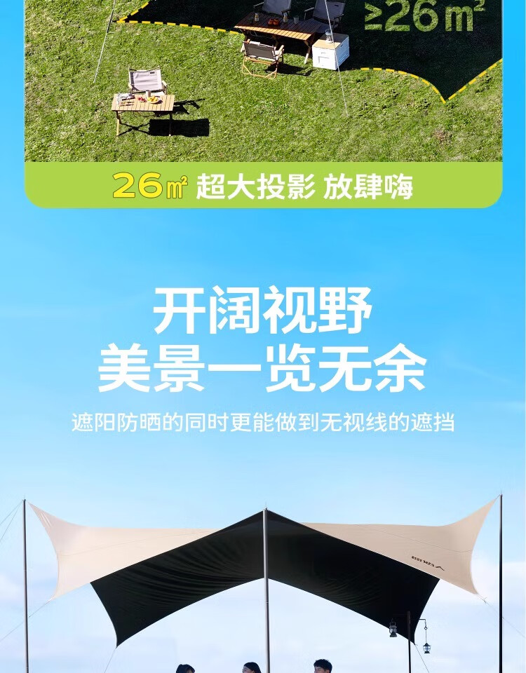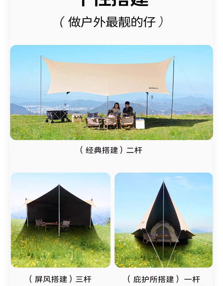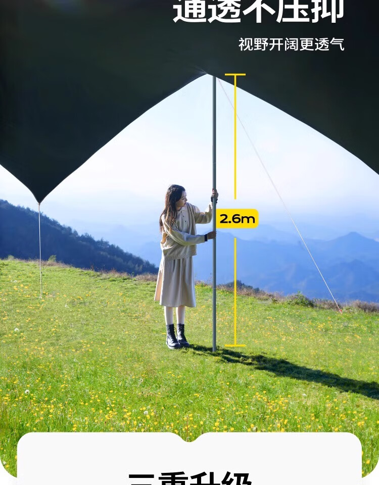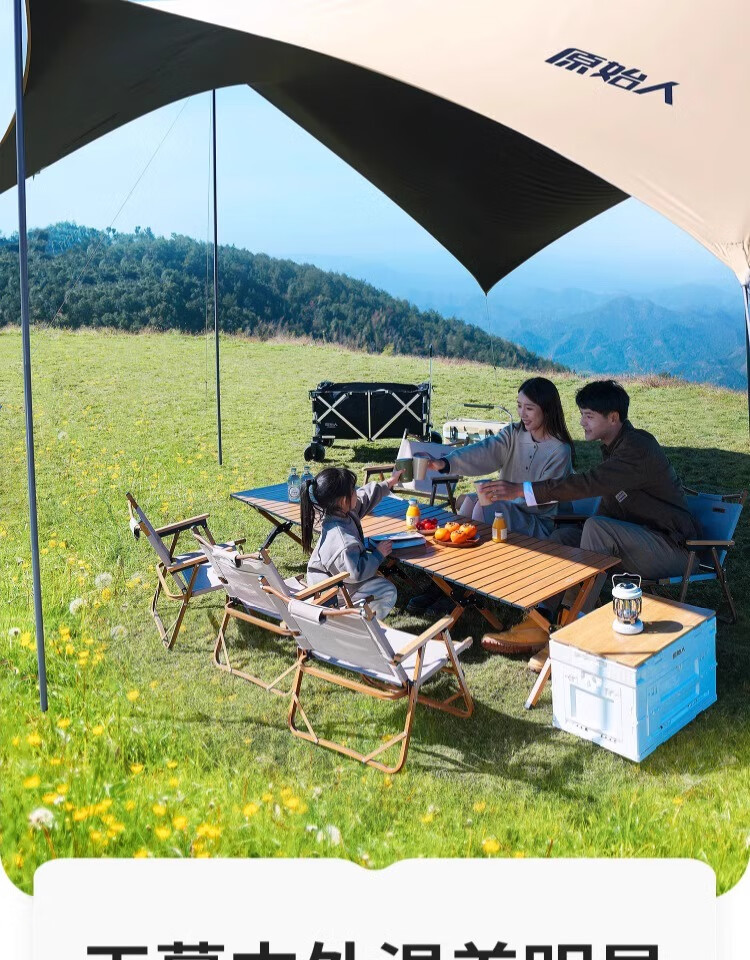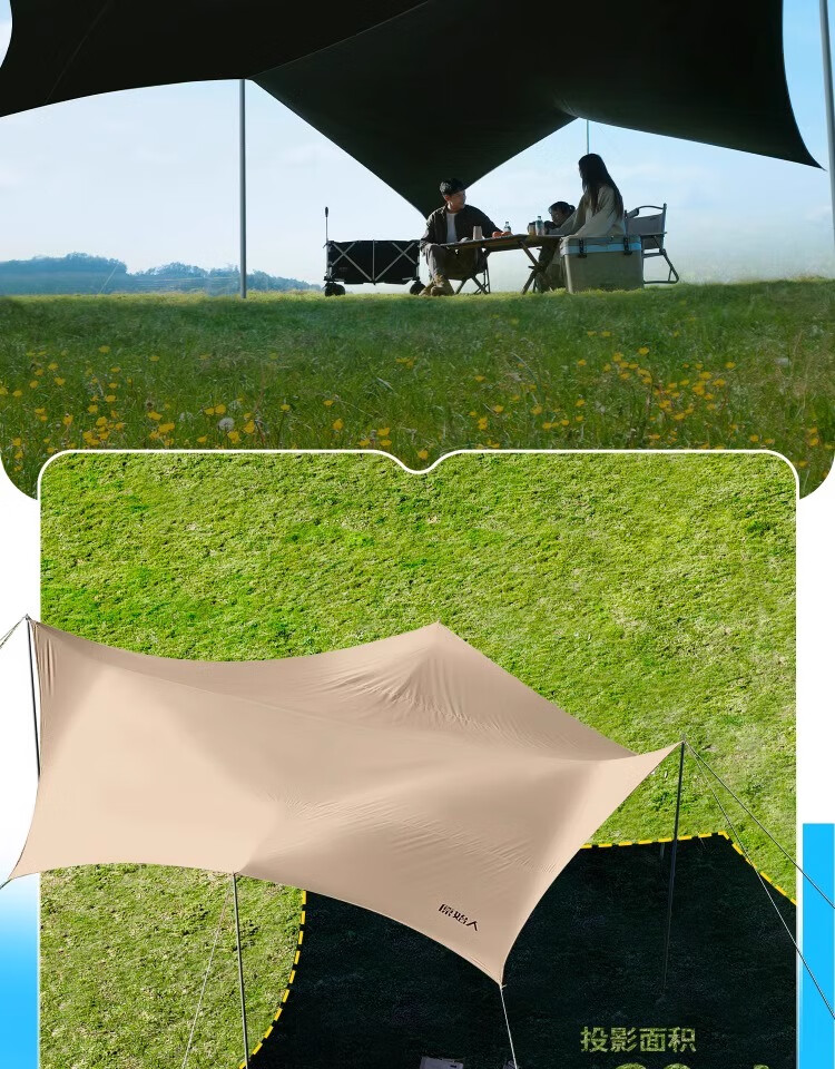 原始人四杆黑胶天幕帐篷户外大号露营装备全套野营野餐防晒遮阳棚套装 20平四杆搭建【杏米白】2.6M高杆