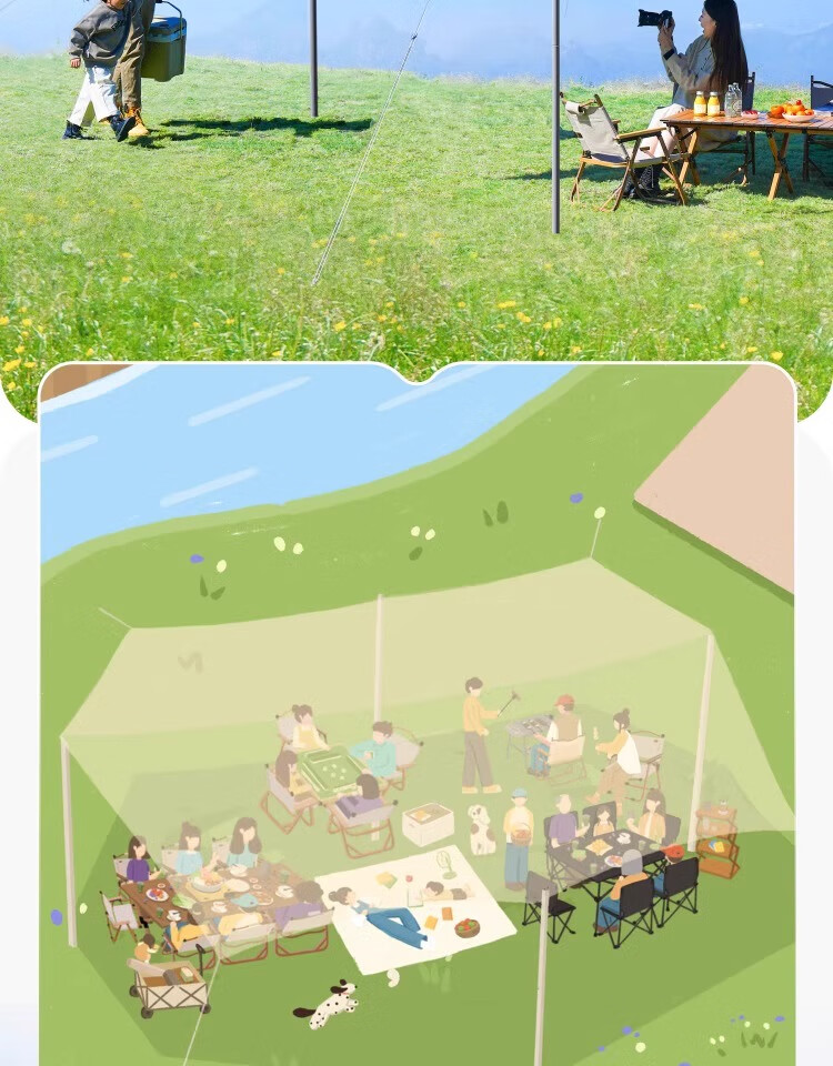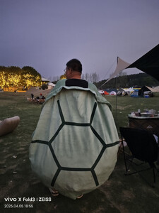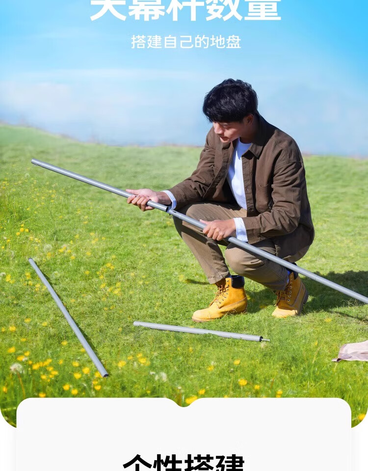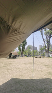 防水效果:没有试过,目前才用了一次。 适用场景:户外草地。 容纳人数:8-10人是没问题的。 透气效果:透气效果? 展开类型:八个角。 便携性能:有专门的收纳包。 特意买的四个撑杆的,除了长边的两个撑杆,额外还配了短边的两个撑杆,这样子有四个角可以撑起来,视野更开阔,2米6高度的撑杆,让几个靠近1米9的高个子也能轻松站在里面。