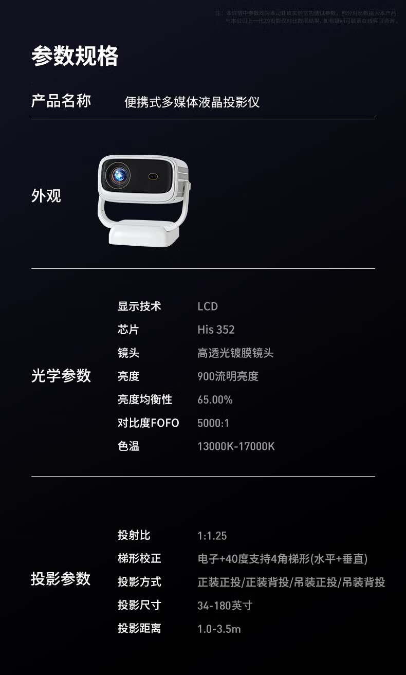 非常小巧的一款投影仪,云台版,播放方便; 手机投屏,电脑HDMI链接等都非常方便。目前是直接投在墙上,画质清晰,我是侧着投屏的,还可以自动对焦,非常方便;音质也不错。宝贝做工真的非常精细,细节真的棒,性价比也很高,质量也很好,物流也快,一天就到货了!不错不错不错不错不错不错