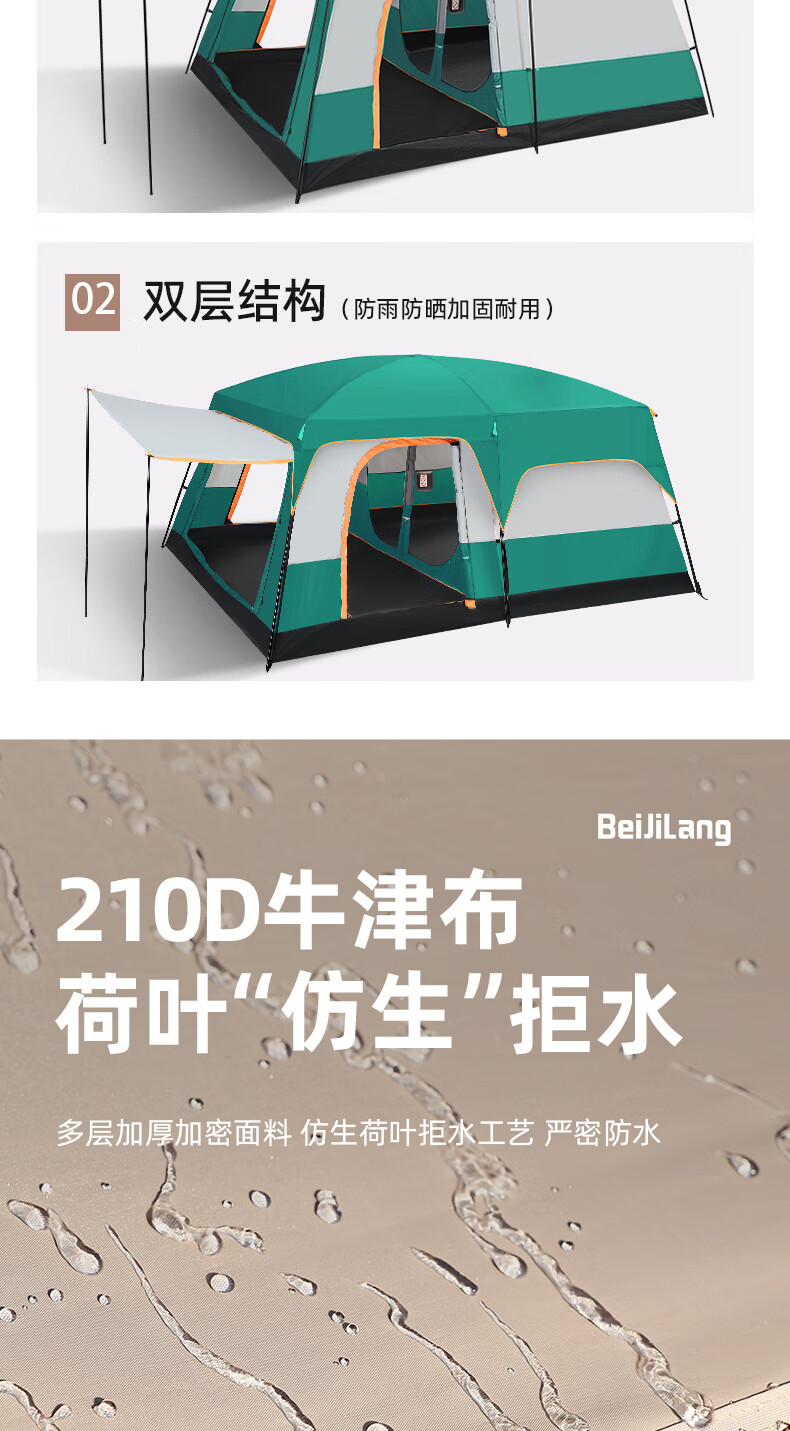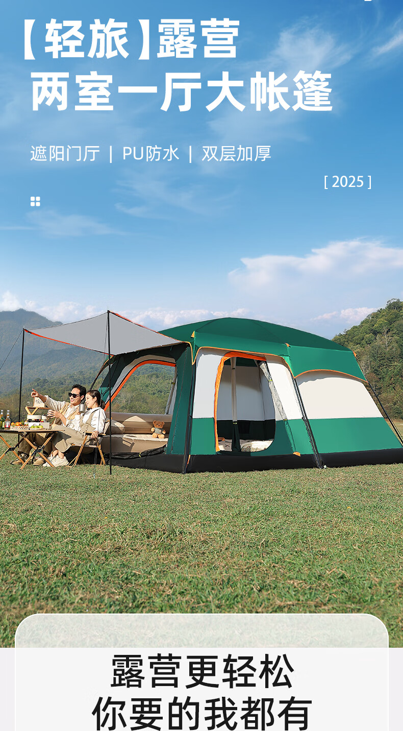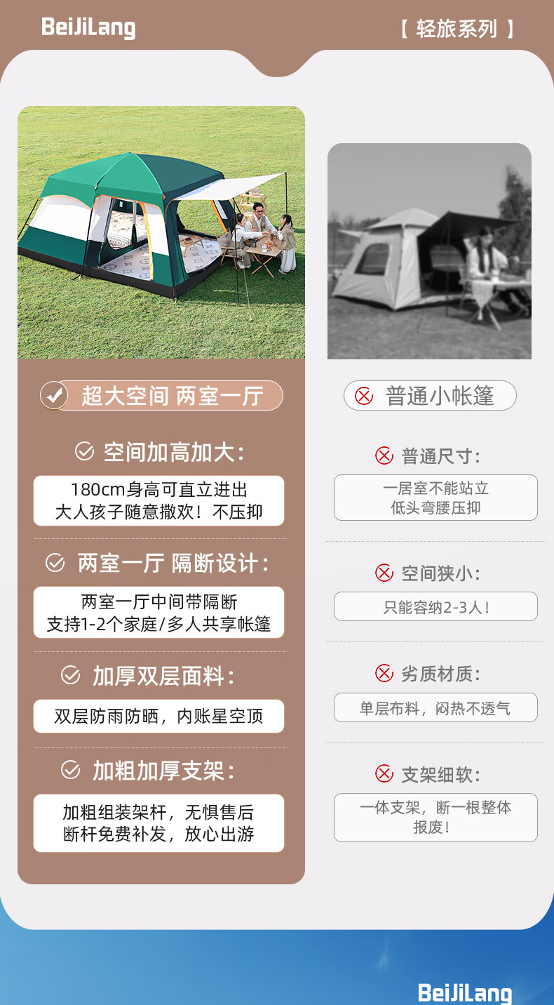 北极狼(BeiJiLang)帐篷户外露营防雨过夜两室一厅大空间双层防晒大帐篷野营装备全套 墨绿色【充气床×2套餐二】 中号6-8人【380*260*200CM】