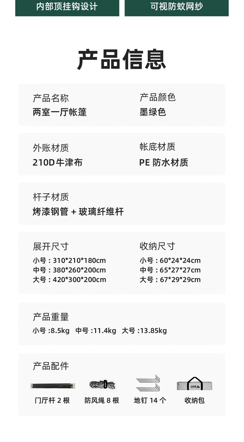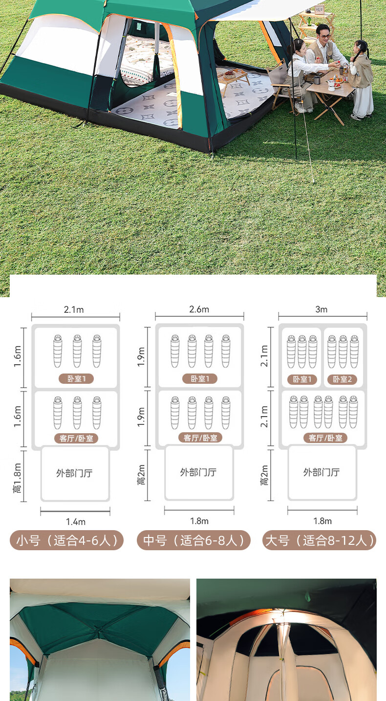 挑了又挑,选了又选,总算没有选错😄😄!北极狼两室一厅帐篷,收到货后好开心!用料材质、做工都非常的不错,小号就足以满足一家出游用了,可宽松的容纳4—6人,关键是高度足够,能在里面自由走动,用餐休息都非常的方便,透气效果也非常的好!携带起来非常方便!绿色也很漂亮!总之很好!赞了赞了👍👍👍!准备下个月出游,到时再拍实地的图片分享给大家。拿回来是在车库里组装起来的,由于空间有限,所以拍的图片不好,见谅!