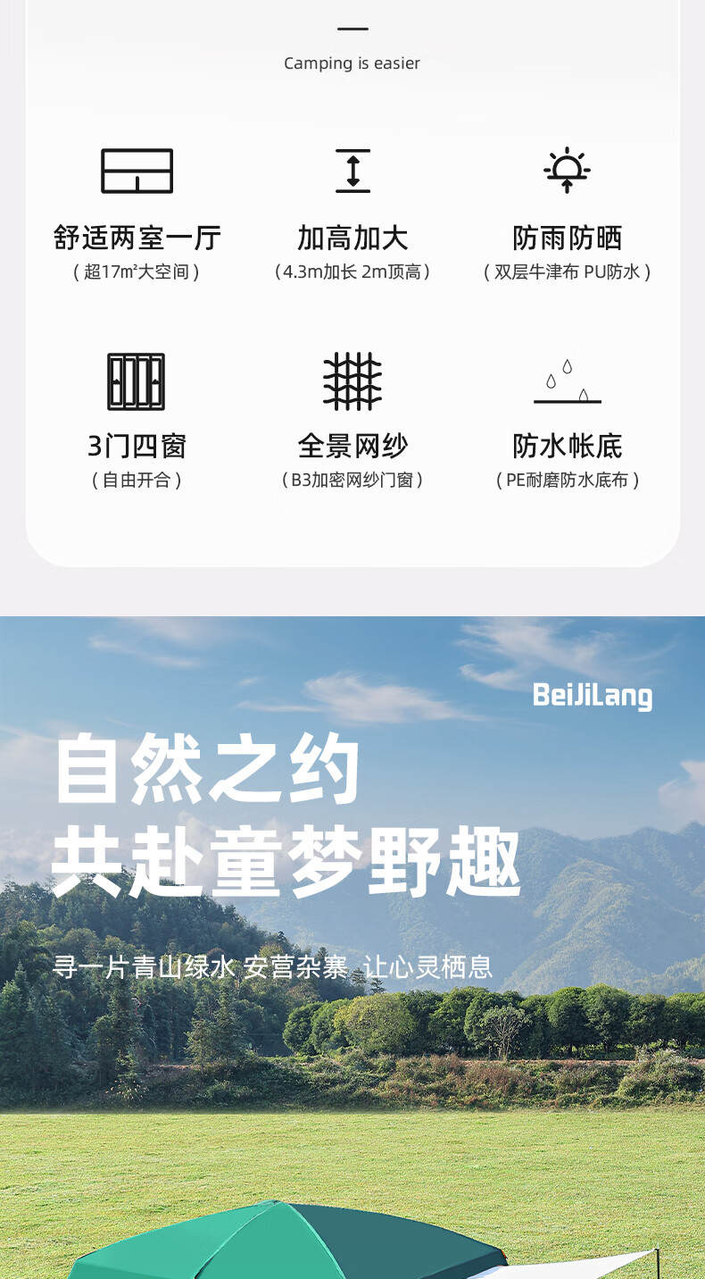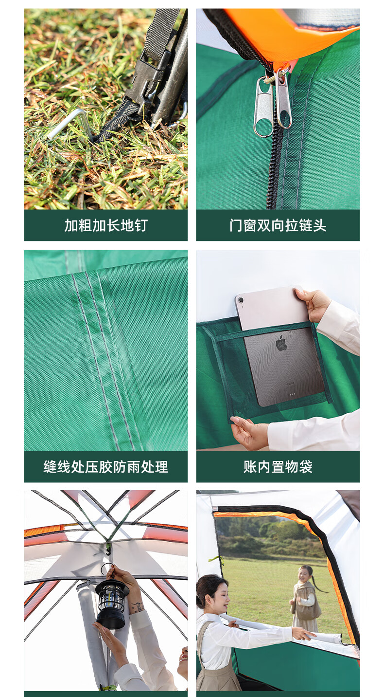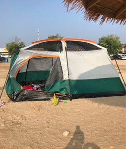 这款帐篷是对比了多家之后选的,颜色好看,亮堂,质量好,耐用,搭建也方便快捷。在沙滩上支起来很吸睛,两室一厅的容量,足够一家人用了,宽大、敞亮,进出方便,出去宿营用是一道风景线!喜欢的朋友放心购买
