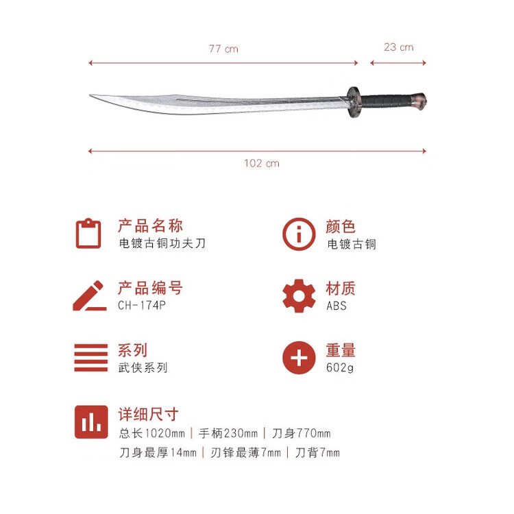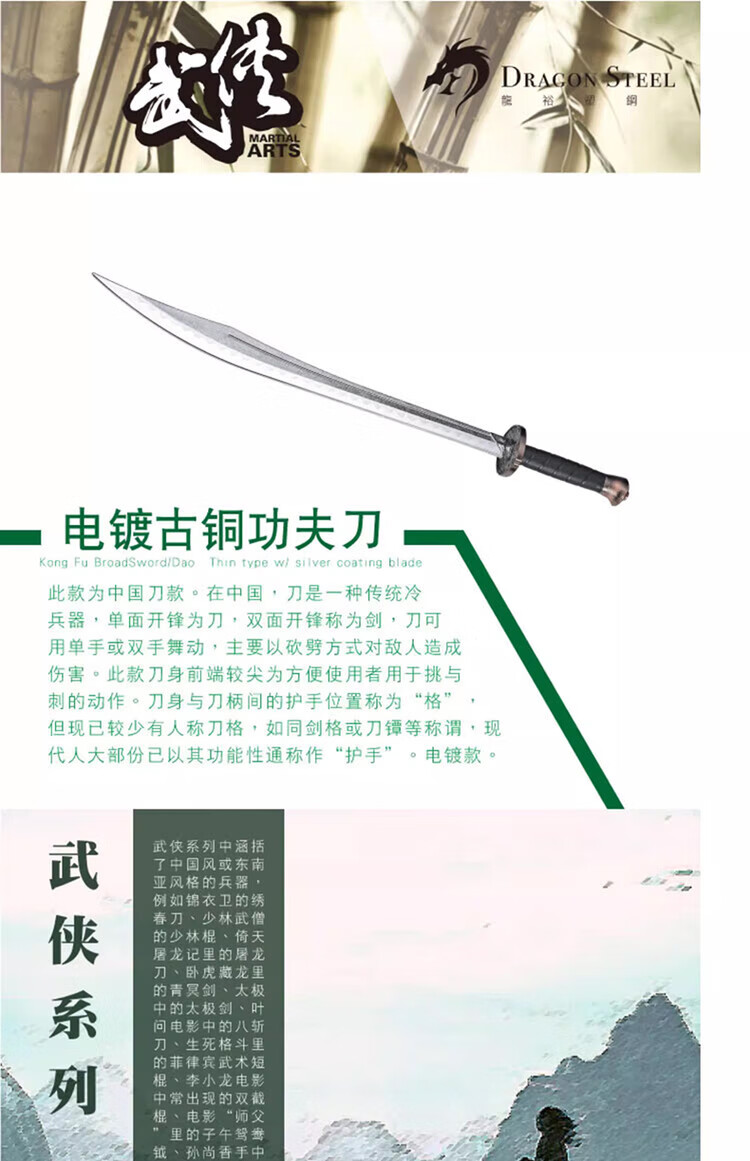COLD STEEL台湾龙裕电镀版功夫刀柳叶刀塑钢练习刀塑胶武术表演结实可对抗 电镀古铜功夫刀 1 全长97厘米