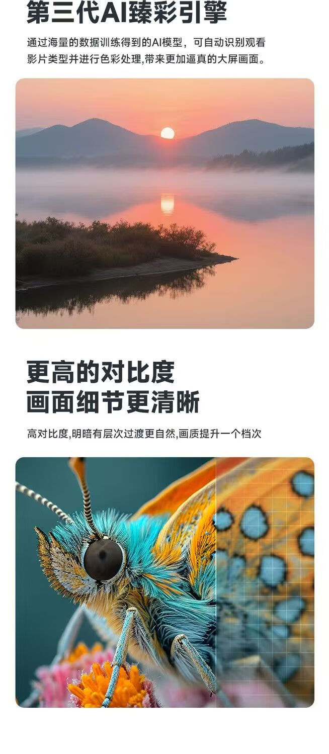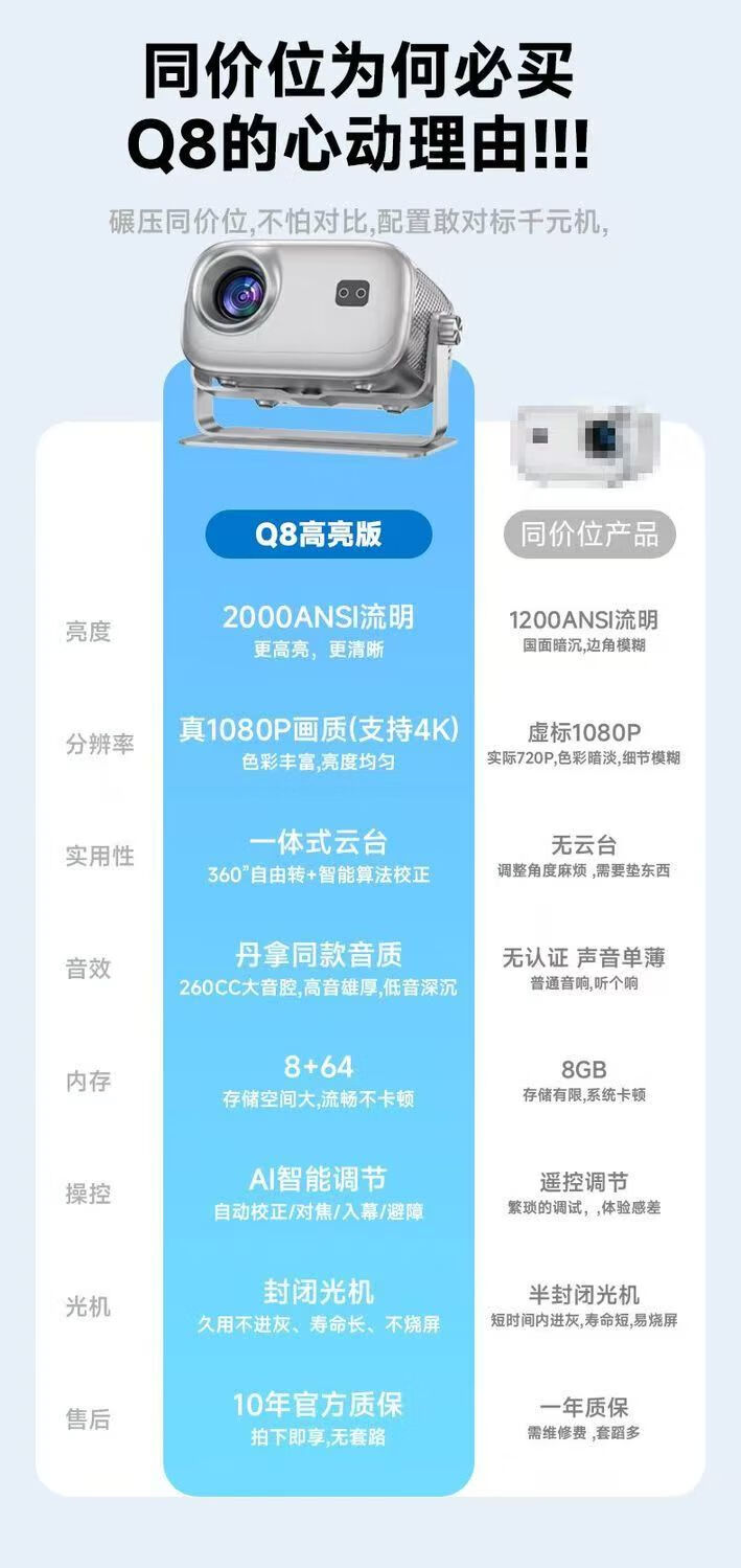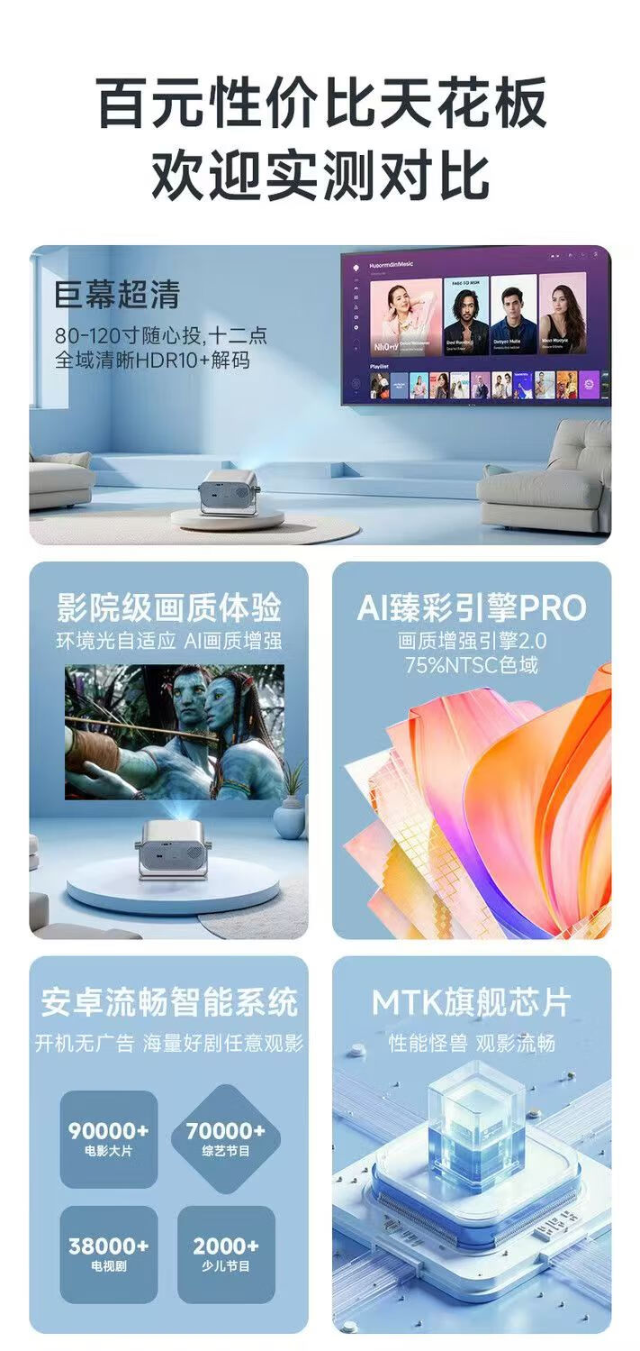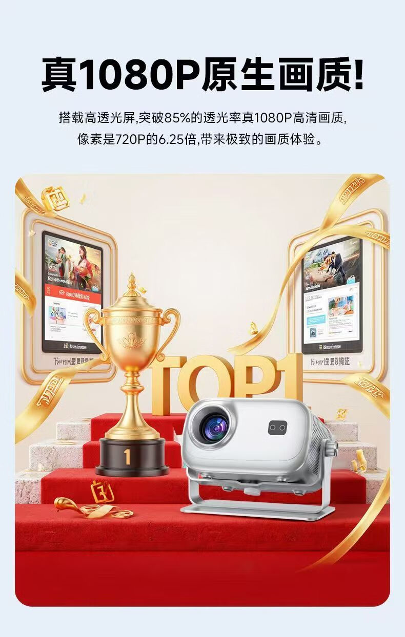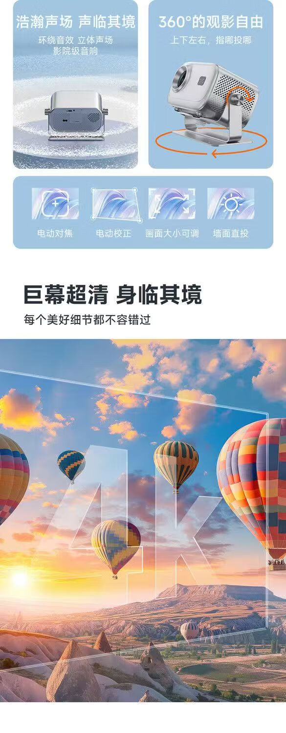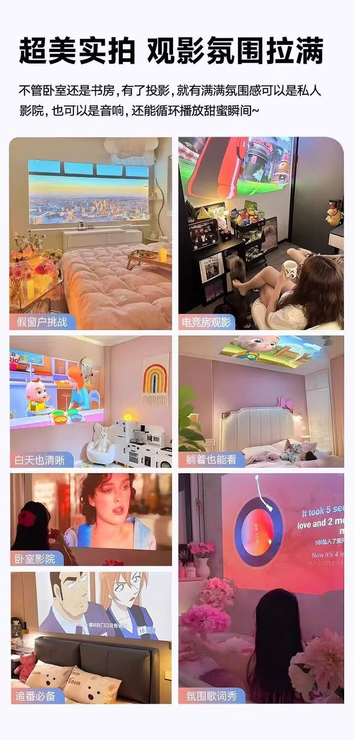 图对焦方便,遥控按一下就完事了,不像朋友买的三百的还要在机器上对焦那个轮子。还是我这个好,亮度更高清。分辨率比较高,1080P ,4K都可以看。噪音没听到,运作的时候超级静音的。,很棒呀。手机投屏非常顺畅,这个是我第一次买投影仪就很成功的一次。给我新搬的小屋增加了不少氛围感,周末追剧很惬意,也可以直接投个图片在墙上,超级有感觉的~