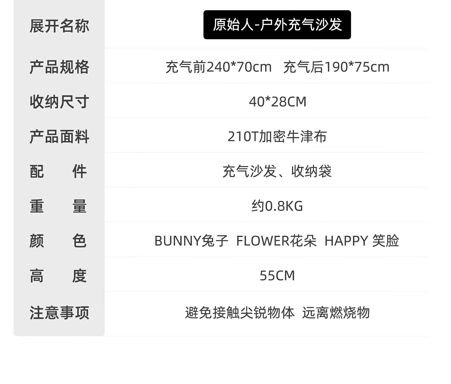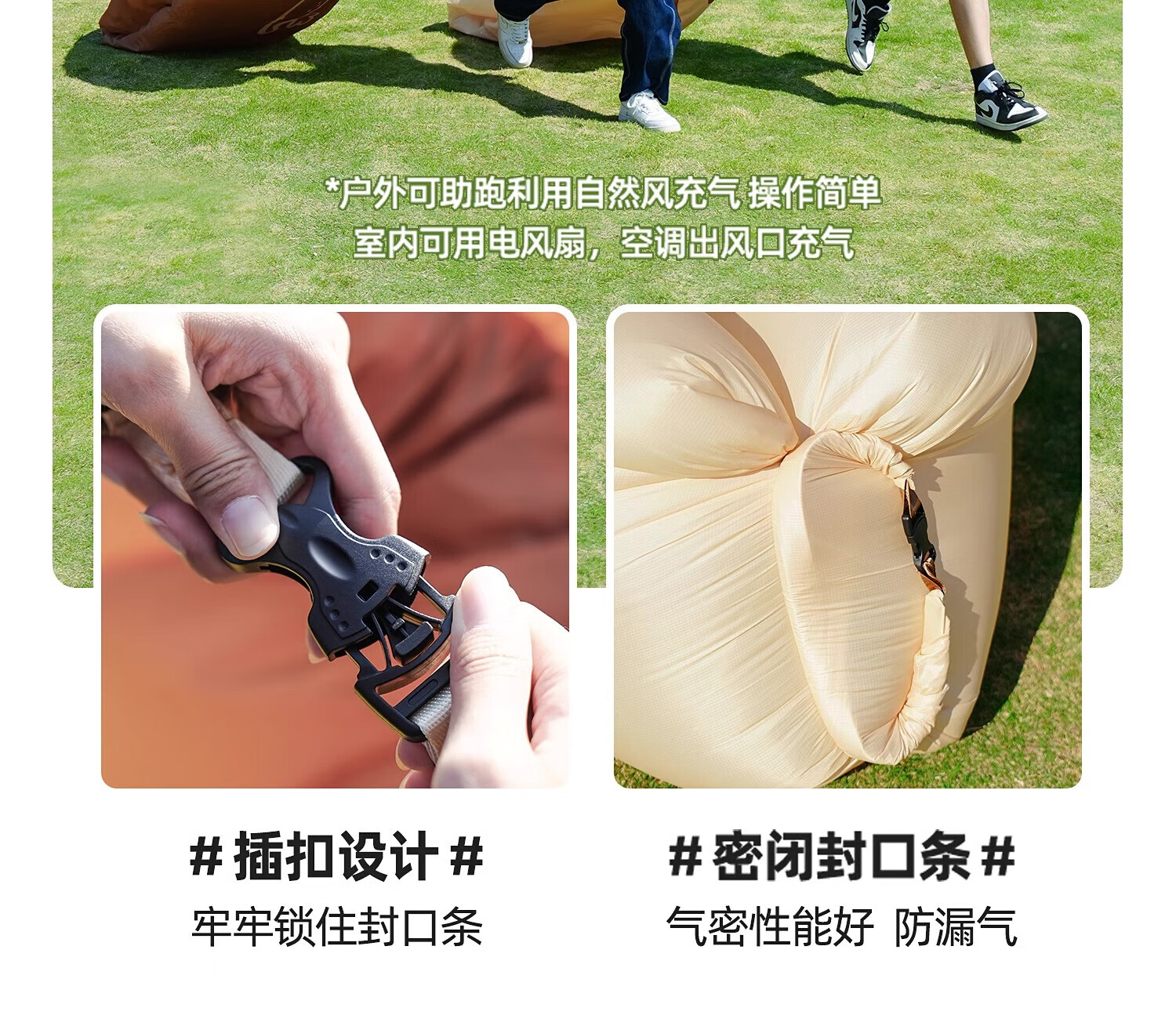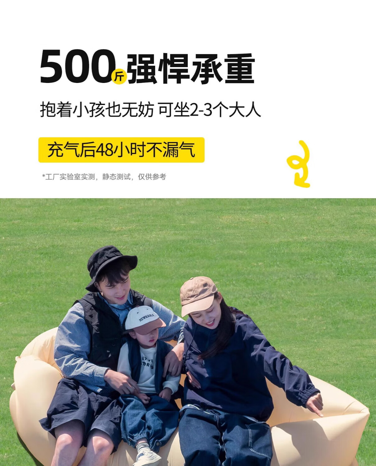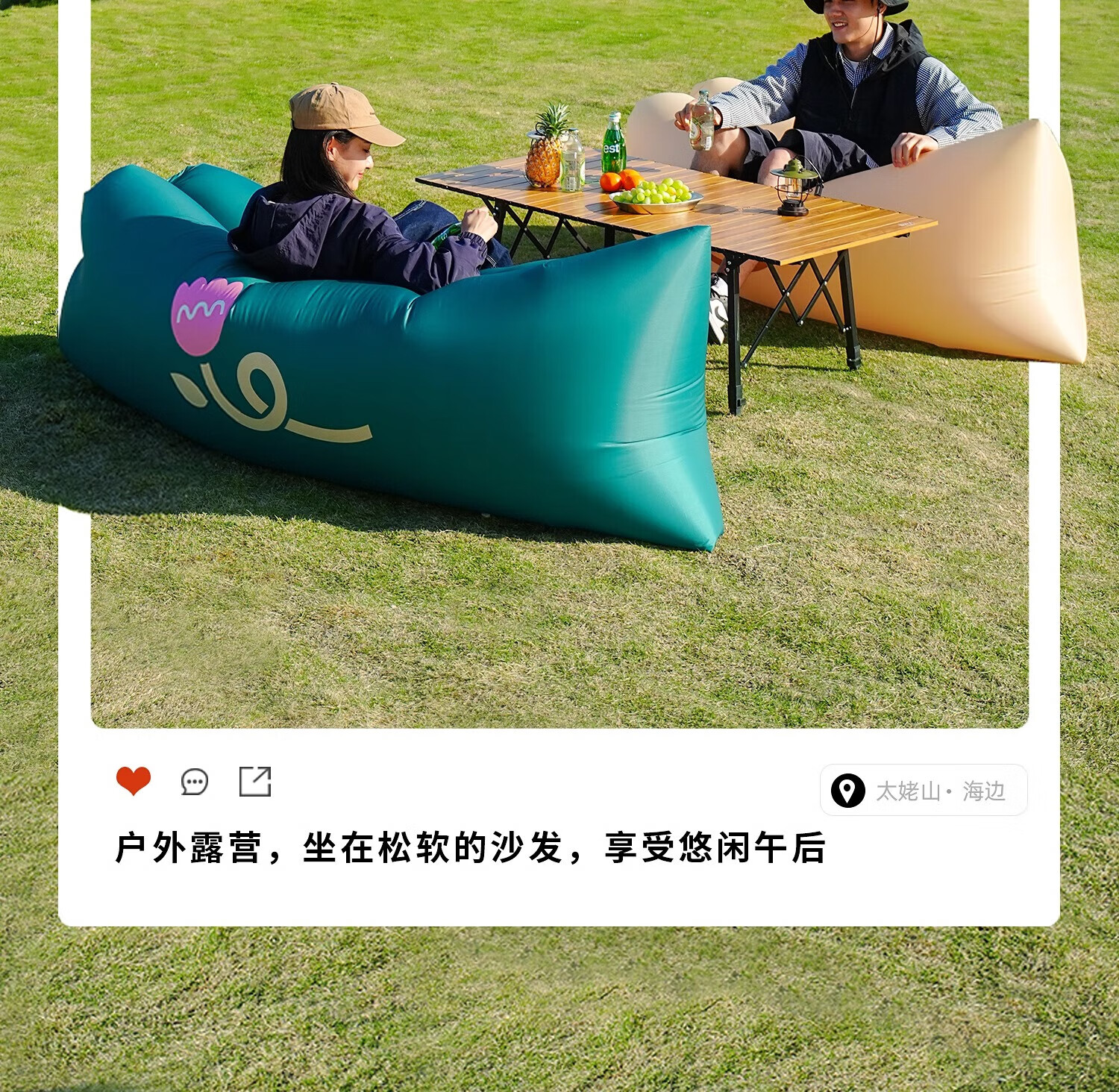 外观的撞色设计挺时尚,颜色也很鲜艳,非常吸引人,沙发很容易出气,特别是客服给的视频,简洁易懂,不需要泵几分钟就可以膨胀到完整大小,这对喜欢户外活动的我来说特别方便。躺在上面很舒服,即使长时间躺着也没有感到不适