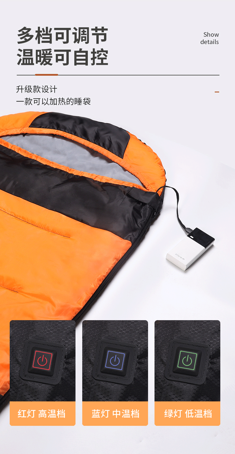 这款睡袋真的很实用,冬天露营再也不怕冷了。USB加热功能太给力,插上充电宝就能持续保暖,温度可以自己调节,特别方便。面料很厚实,防风效果也不错,晚上睡觉特别暖和。收纳起来也不占地方,携带方便。性价比很高。