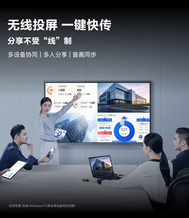 产品质量很好,客服和售后都很耐心,有手机投屏,ipad投屏和电脑投屏,无卡顿,还有可以做电子白板。也可以分享。最关键的是比投影呈现的画质更好