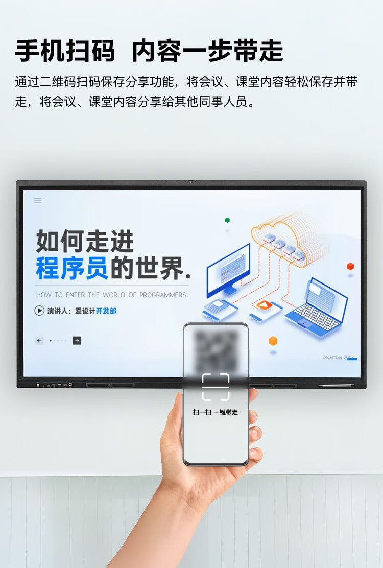 一收到货就立马安装了,安装师傅很专业,售后服务人员还讲解了很多功能的使用方法。使用起来也简单方便,还能进行白板书写、扫码分享等