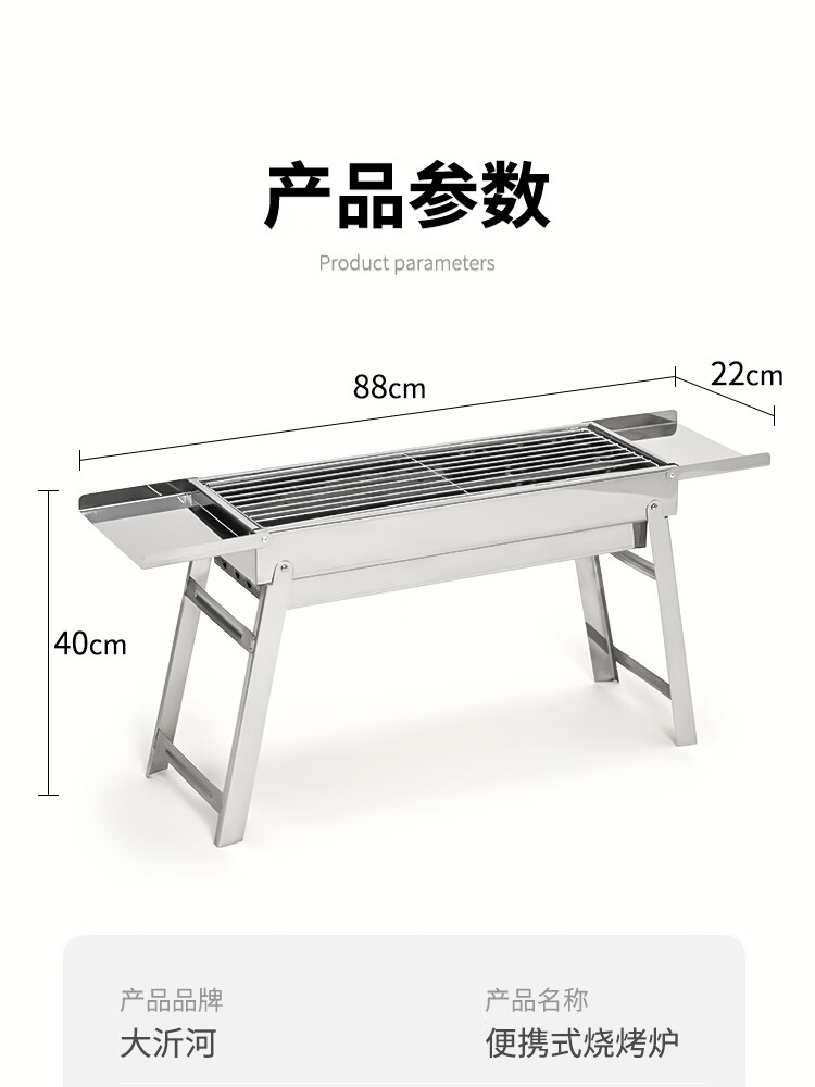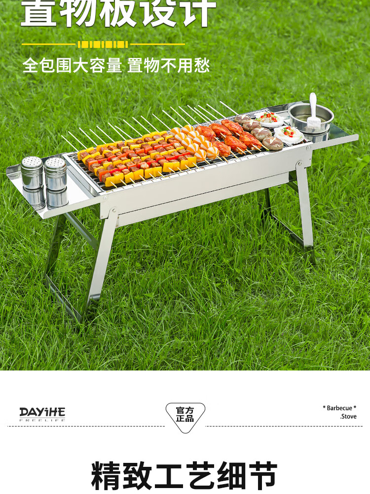 大钢炮/秒折叠不锈钢野餐炉50*17滑轨碳烤炉户外装备 不锈钢本色 50公分*17公分