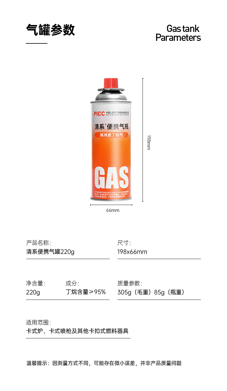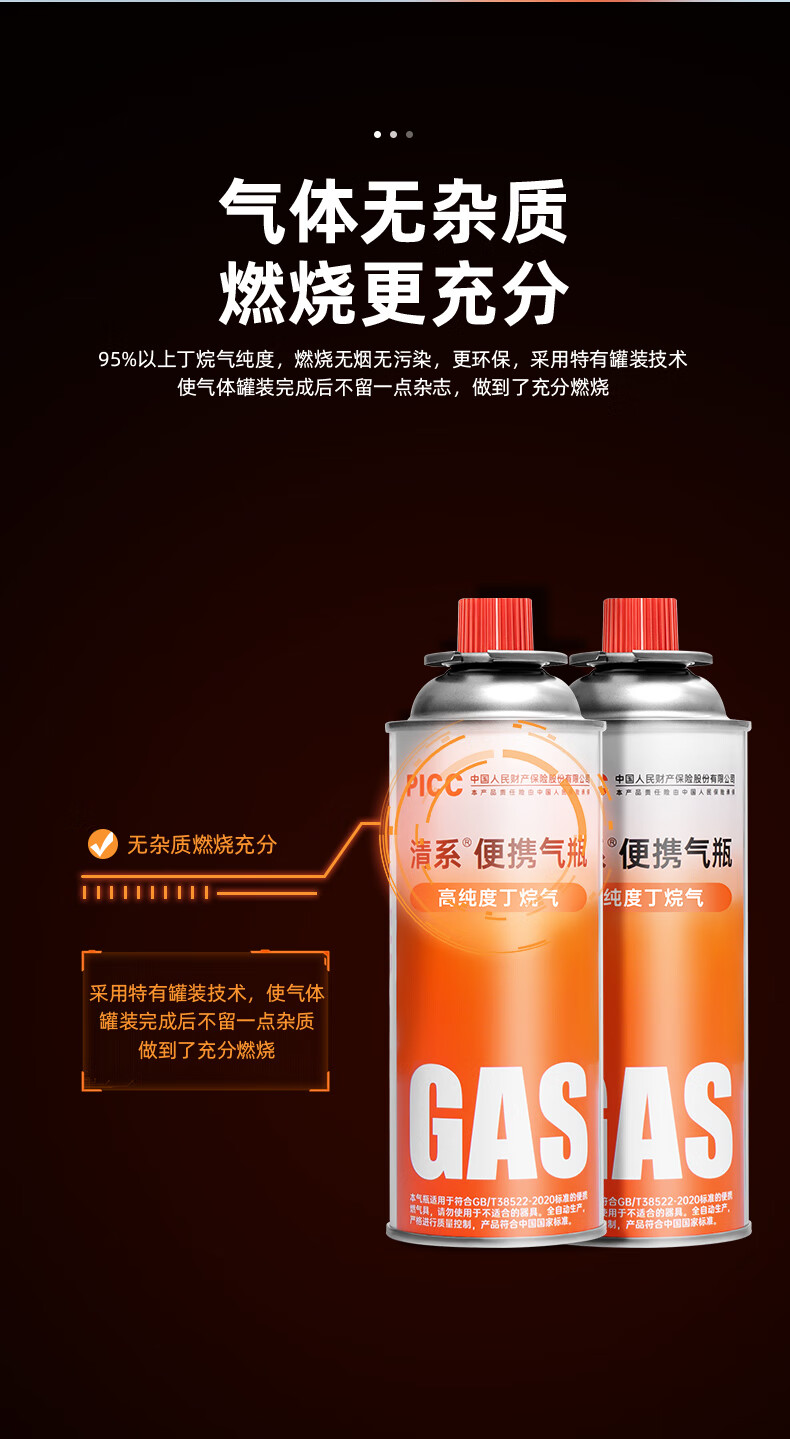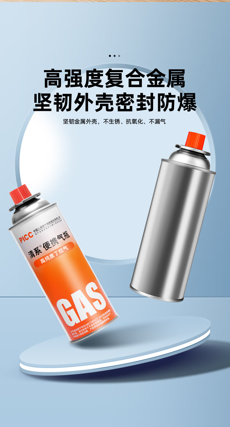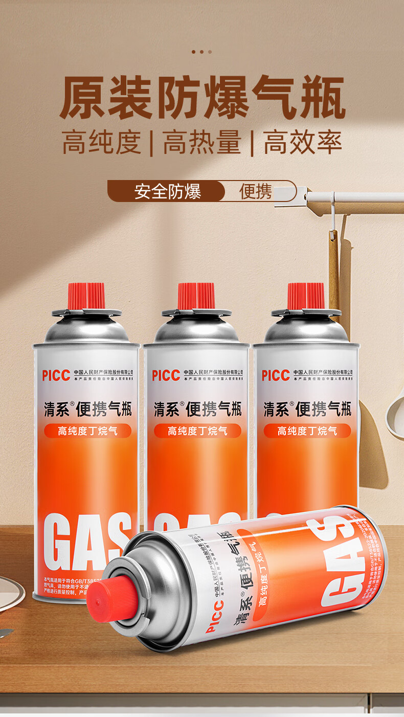 清系户外便携卡式炉防爆气罐220g*8 优点 - 性价比高:价格实惠,平均下来2块多一瓶,对于户外用气来说,是比较经济的选择。 - 使用方便:与大多数卡式炉通用,安装简单,一拧就可以搞定。即开即用,无需复杂的安装和调试过程。 - 火力强劲:丁烷燃烧充分,能提供稳定且足够的热量,产生蓝色火焰,升温快速,可满足户外烧水、煮饭、炒菜、烤肉等多种烹饪需求。一罐燃料约可燃烧120 - 180分钟,能满足一次野炊、两次火锅或三次烧烤的使用。 - 安全性高:具有防爆设计,有过压保护装置,当气罐内压力过高时会自动泄压,降低爆炸风险。罐身采用坚韧金属外壳,高密封不漏气,能承受一定的压力和碰撞。