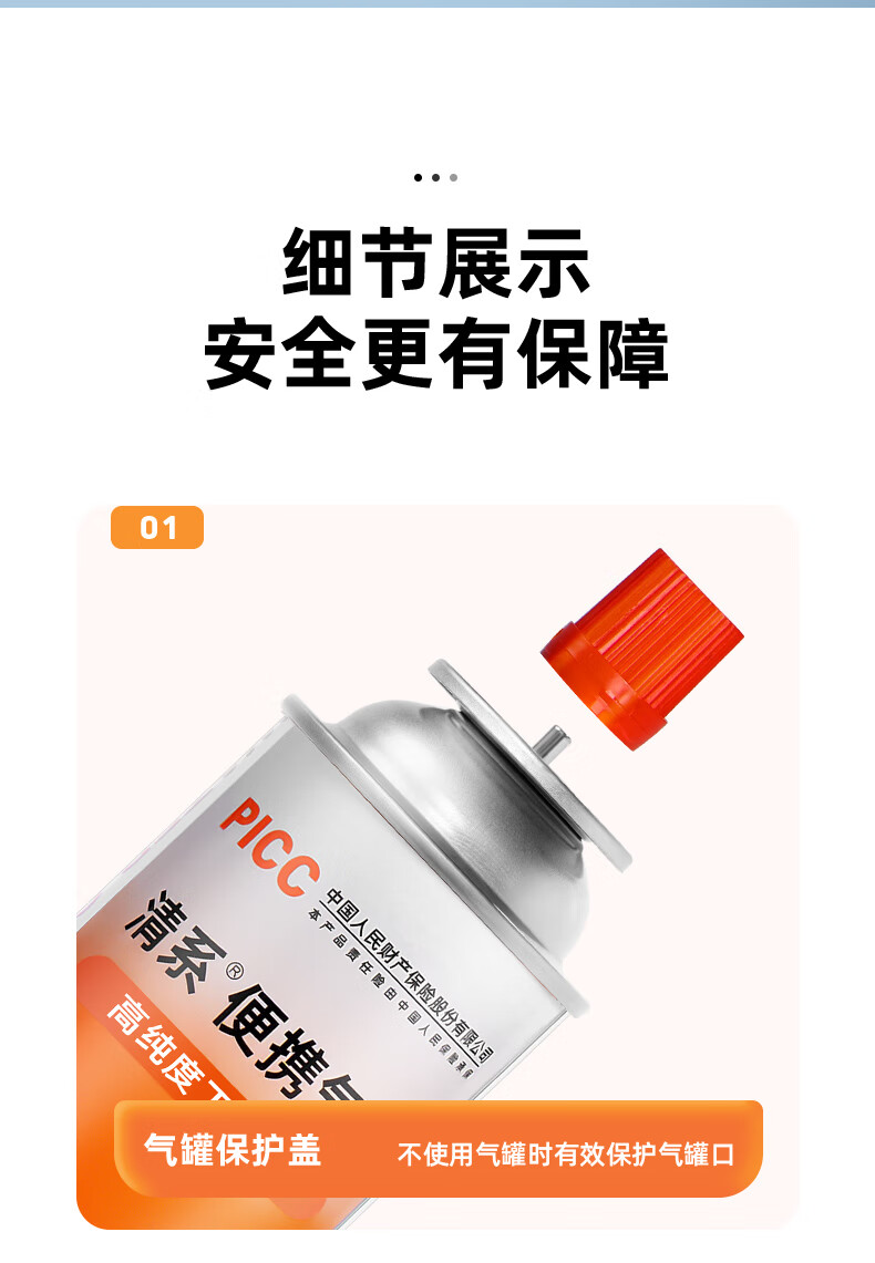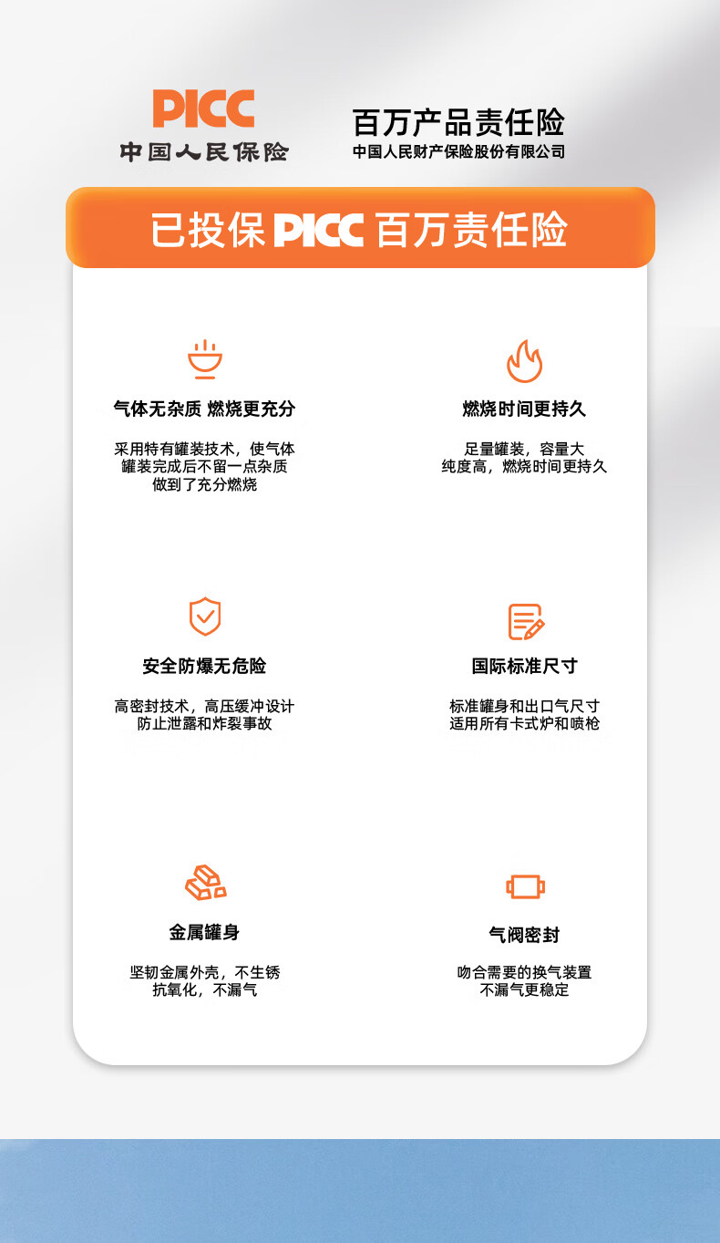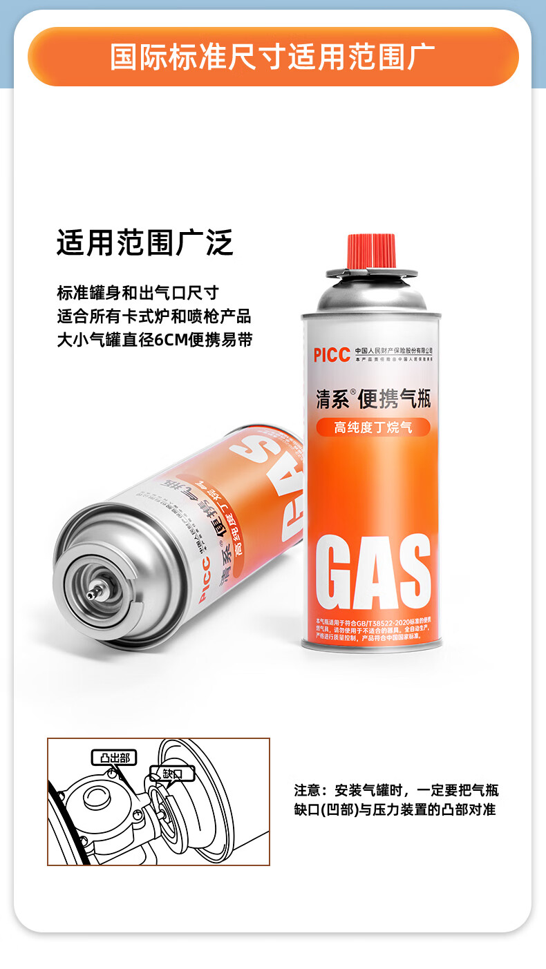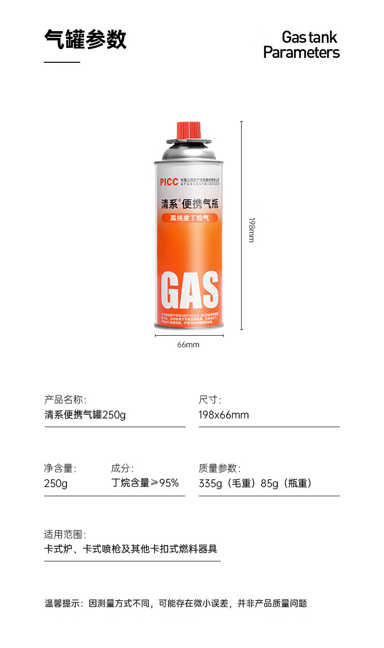清系户外便携卡式炉防爆气罐220g*8 优点 - 性价比高:价格实惠,平均下来2块多一瓶,对于户外用气来说,是比较经济的选择。 - 使用方便:与大多数卡式炉通用,安装简单,一拧就可以搞定。即开即用,无需复杂的安装和调试过程。 - 火力强劲:丁烷燃烧充分,能提供稳定且足够的热量,产生蓝色火焰,升温快速,可满足户外烧水、煮饭、炒菜、烤肉等多种烹饪需求。一罐燃料约可燃烧120 - 180分钟,能满足一次野炊、两次火锅或三次烧烤的使用。 - 安全性高:具有防爆设计,有过压保护装置,当气罐内压力过高时会自动泄压,降低爆炸风险。罐身采用坚韧金属外壳,高密封不漏气,能承受一定的压力和碰撞。